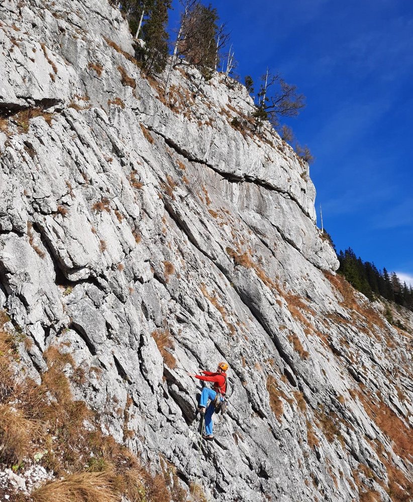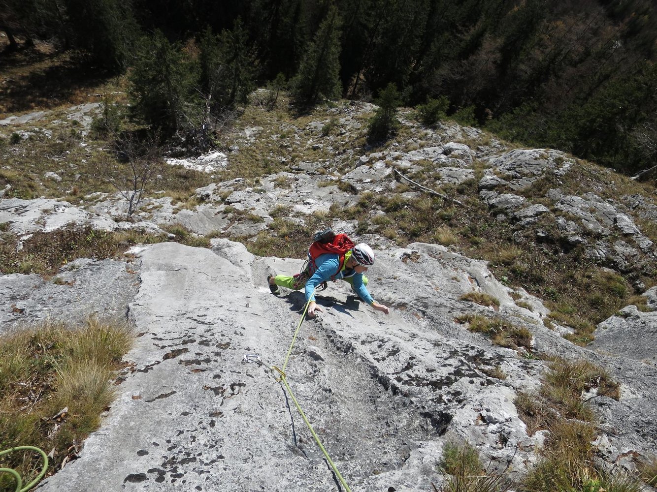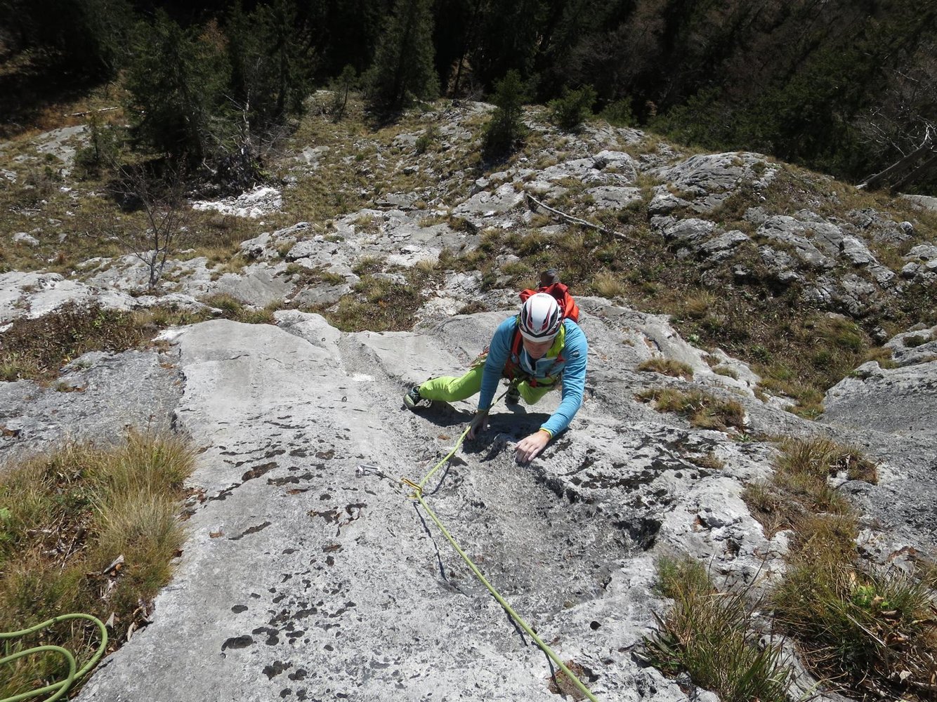 Nette im Plaisirstil gehaltene Route, die auch mehrere Gehpassagen und auch sonst einiges an Gras aufweist. Dazwischen immer wieder nette, einmal sogar eine sehr schöne Felspassage. Ideal in Verbindung mit einer Kletterei in der Ausweichkogel Westwand.