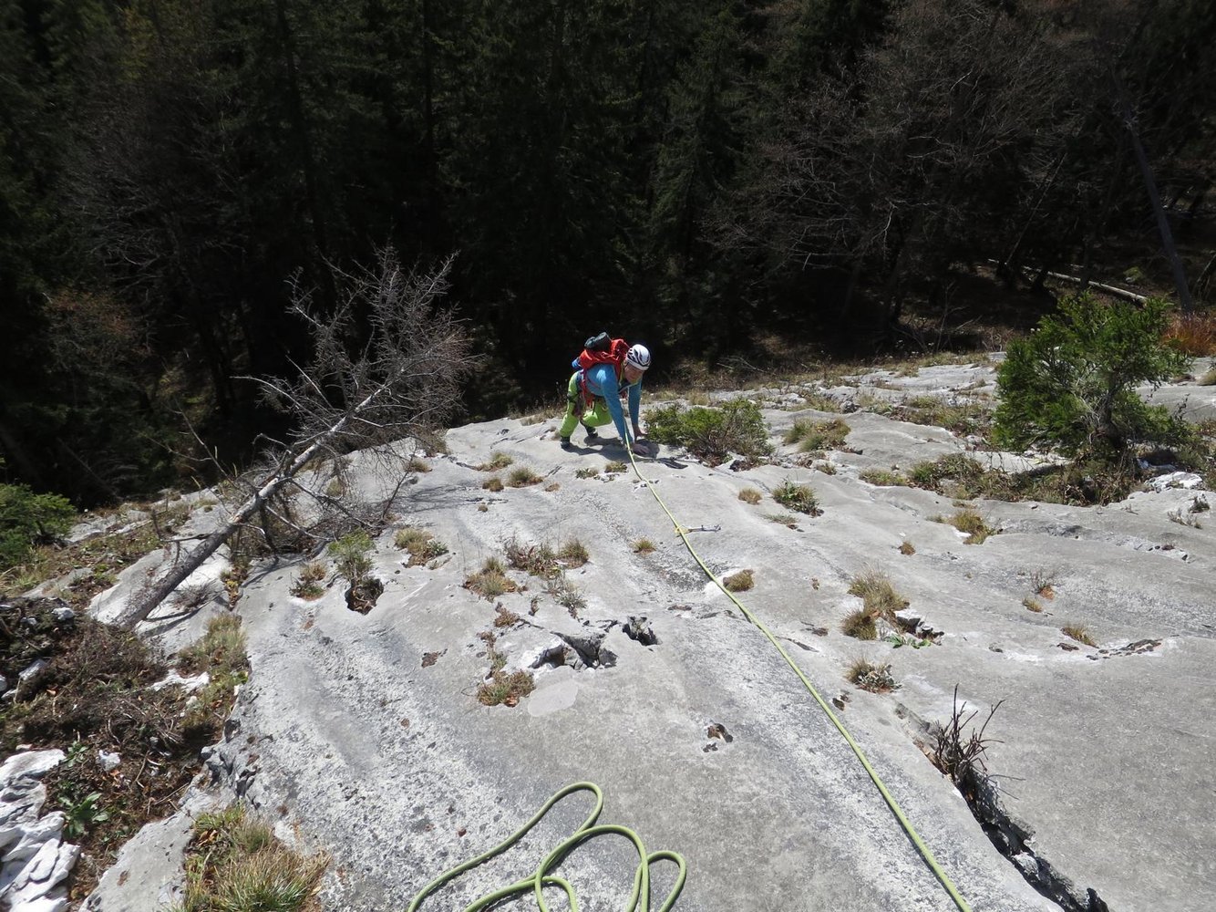 Vom Ausstieg ca. 20 m entlang der Wand weiter zu einer Abseilstelle aufsteigen und 4x25 m abseilen. Siehe dazu Topo und Übersichtsbild!