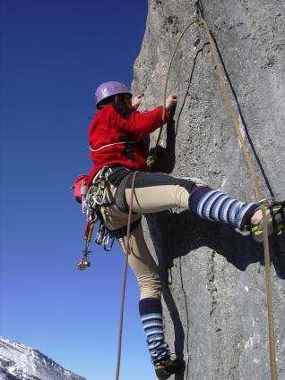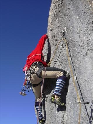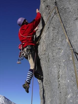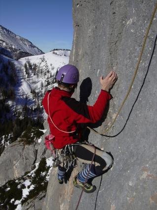 Die 1. SL hat einen technisch netten Einstieg, dem Ausdauerkletterei folg. Am Schluss warte noch eine Aufrichterplatte mit Reibungs- und Gleichgewichtsmäßig grenzwertigen Bewegungen.