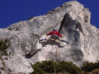 Der Name zeugt von der Gewalt eines vom Ende der 2. SL entfernten Blocks. Obzwar er nicht in der Falllinie der am Wandfuß deponierten Ausrüstung war, hat er doch die sprichwörtliche Kurve gekratzt und bei unserer Ausrüstung am Einstieg eingeschlagen. Die Reste von Ronnys nagelnagelneuem Schischuhen sind somit namensgebend.