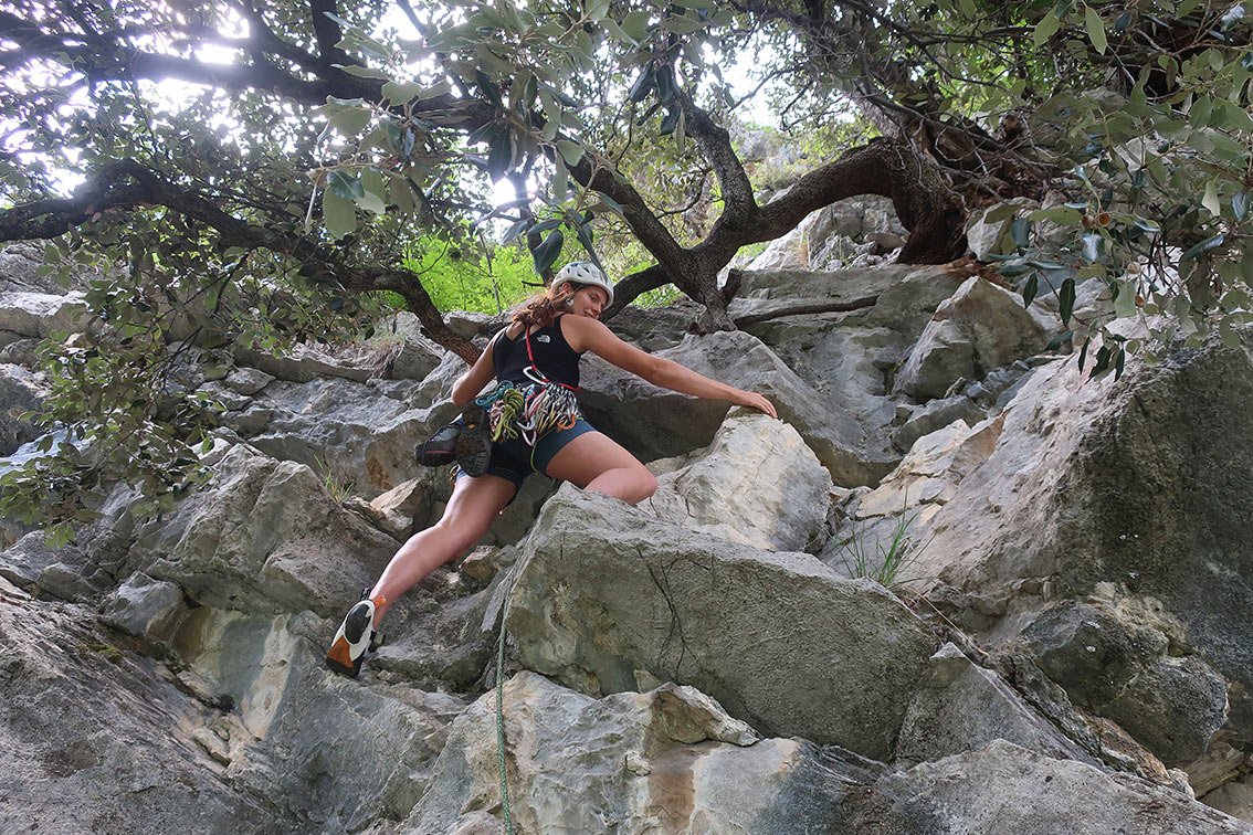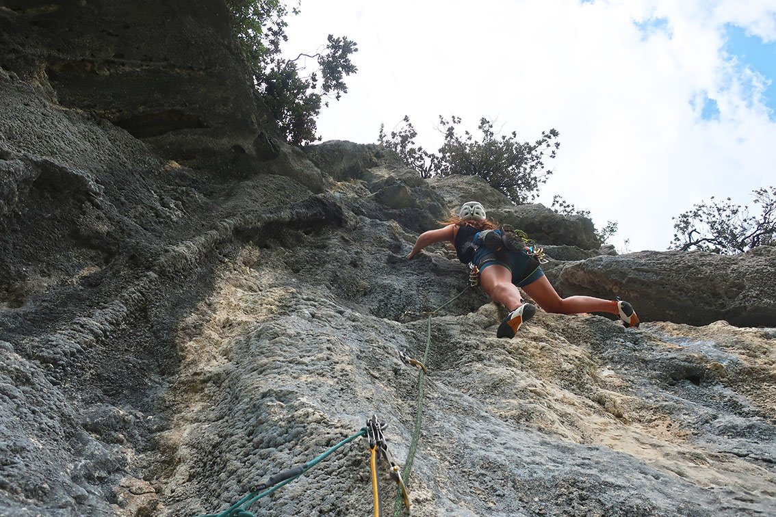 Die Tour ist gut mit Bohrhaken gesichert. In den leichteren Passagen muss man aber schon etwas weiter zum Haken klettern.