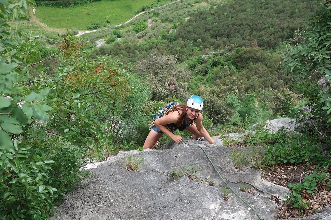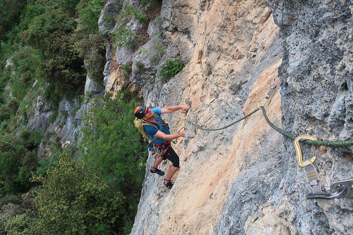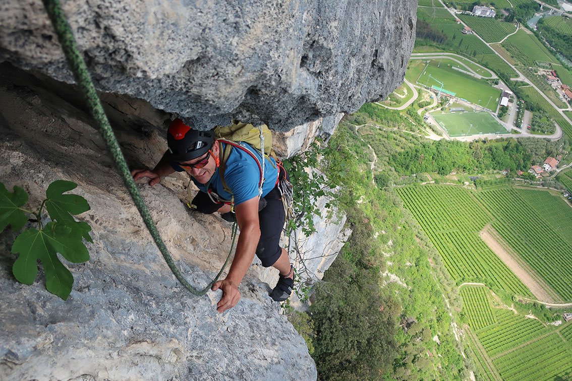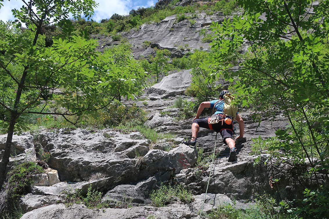Vom Ausstieg auf Pfadspuren nach rechts bis zum Abstiegsklettersteig und auf diesem hinter zum Sportplatz in Dro.