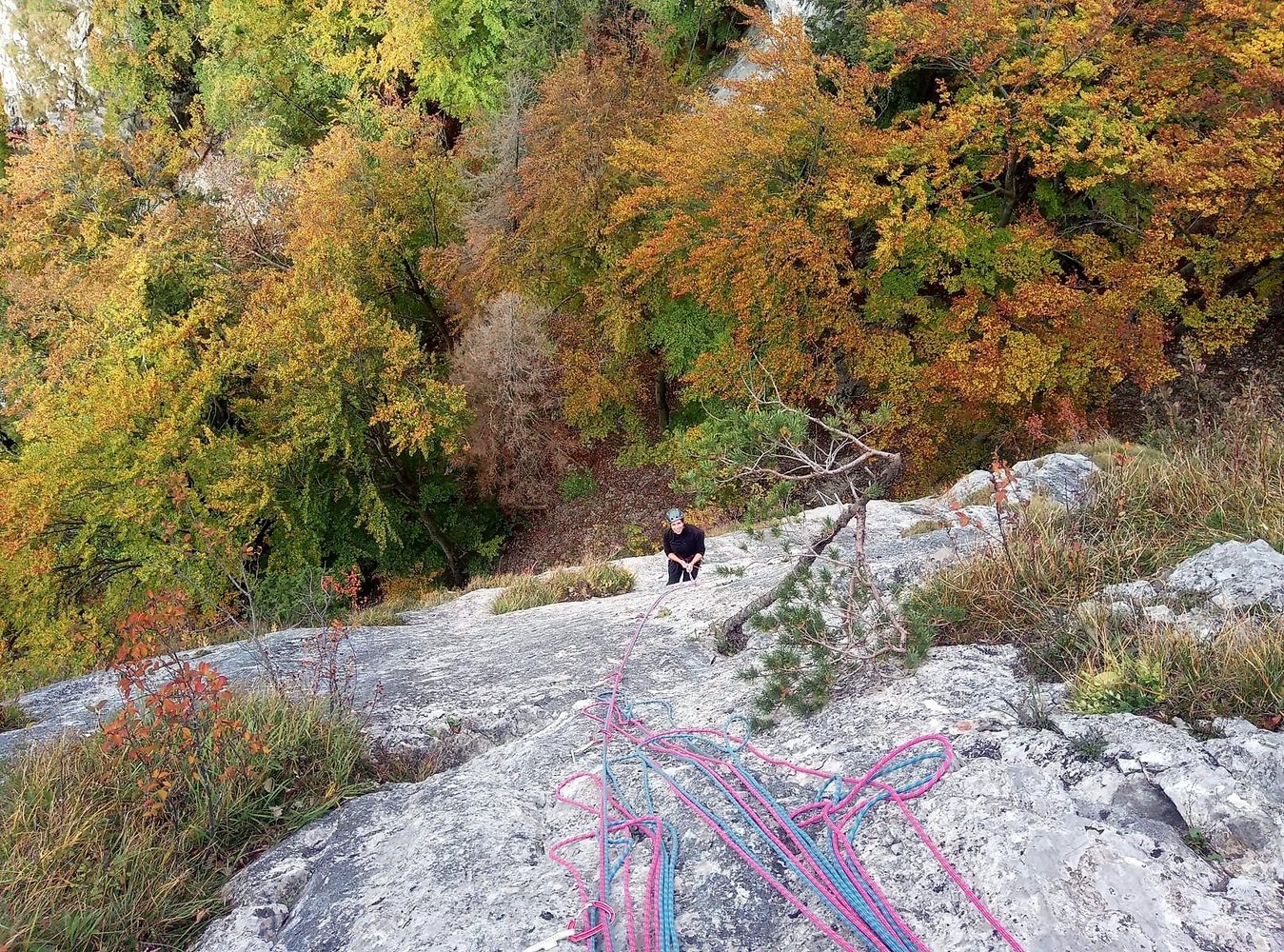 Über die Route mit 60 Meter Einfachseil abseilen. Siehe Topo und Übersichtsbild!