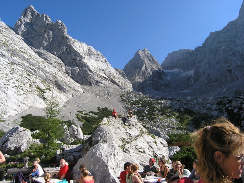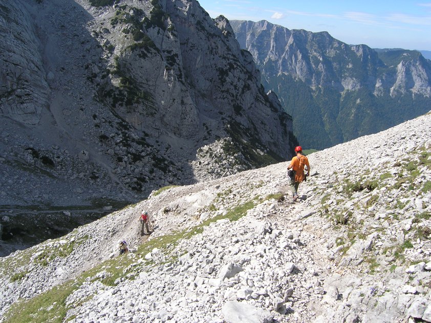 Beim Ausstieg kurz nach rechts zum Normalweg auf die Schärtenspitze (markierter Steig) und über diesen zurück zur Blaueishütte und anschließend hinunter ins Tal.