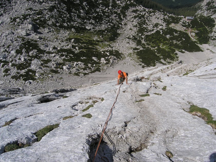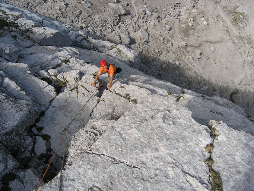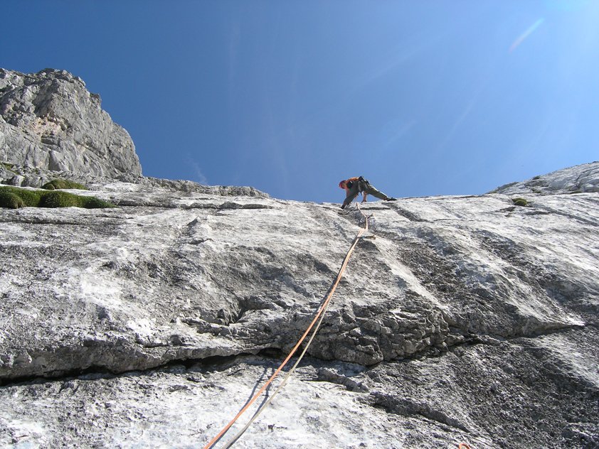 Eine der beliebtesten Touren im Blaueisgebiet, daher kann es in den ersten Seillängen auch immer wieder zu kleineren Verzögerungen kommen. Sehr schöne Plattenkletterei, die nach einigen genussvollen Seillängen in einer kniffligen Plattenstelle endet. Die direkte Variante in der letzten Seillänge ist kühn gesichert.