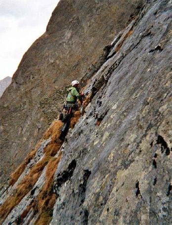 Einstieg bei auffälliger Rampe leicht rechts der Gipfelfallinie, bei Haaken mit Reepschnur. In der 2. Seillänge über Grasfleck zu markanten Verschneidung und über diese empor bis zu BH. Vom 2. Stand 2-3m nach Links und durch Riss empor. In Rissmitte kleiner Überhang ( siehe Fotos). Restliche Seillängen am Topo sichtbar.