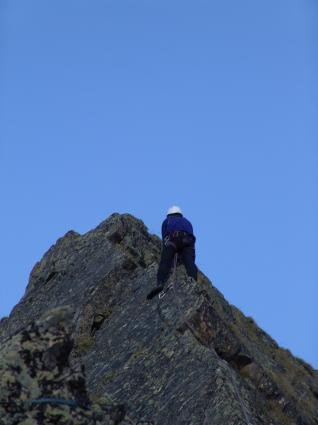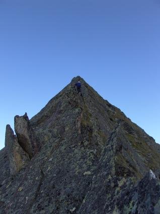 Schöne, aber anspruchsvolle Platten-, Riss- und ausgesetzte Gratkletterei im 6. Schwierigkeitsgrat in gutem Granit. Bei 2 Tagestour Biwakmöglichkeit auf Scharte bei Gratbeginn.