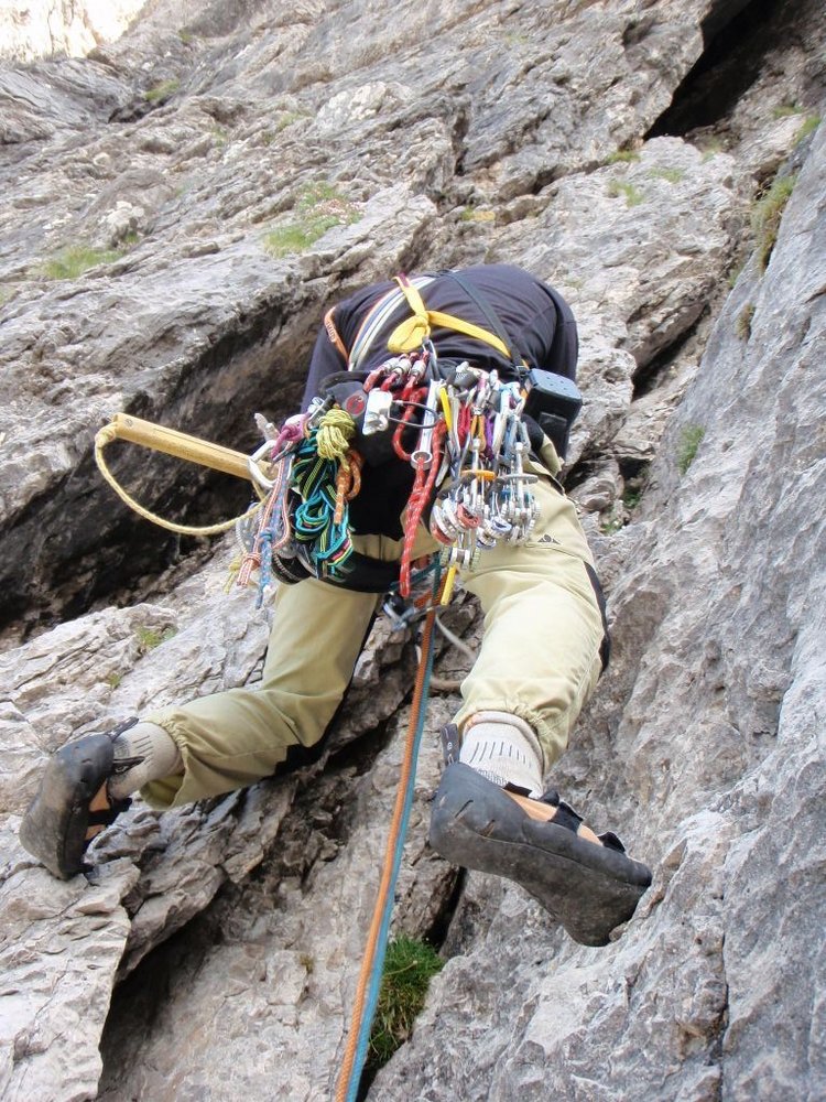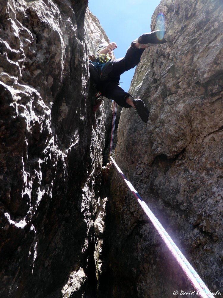 Alpine Kletterei, im oberen Teil Riss- und Kaminkletterei, zum Teil große Hakenabstände.
