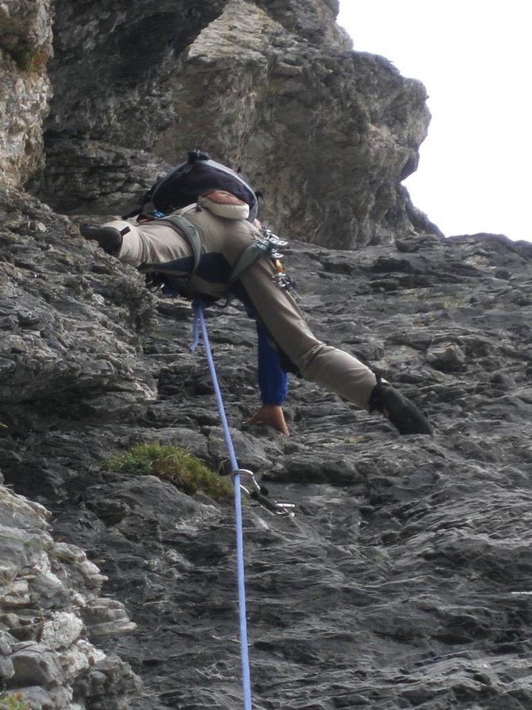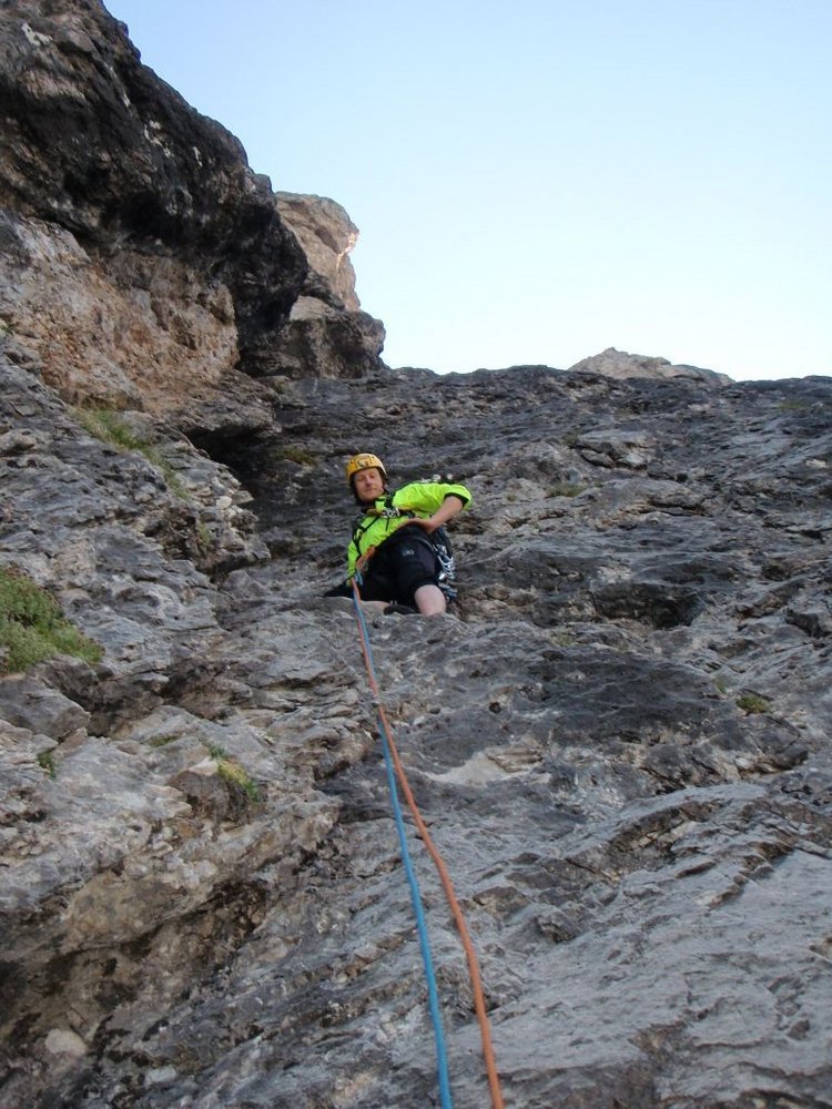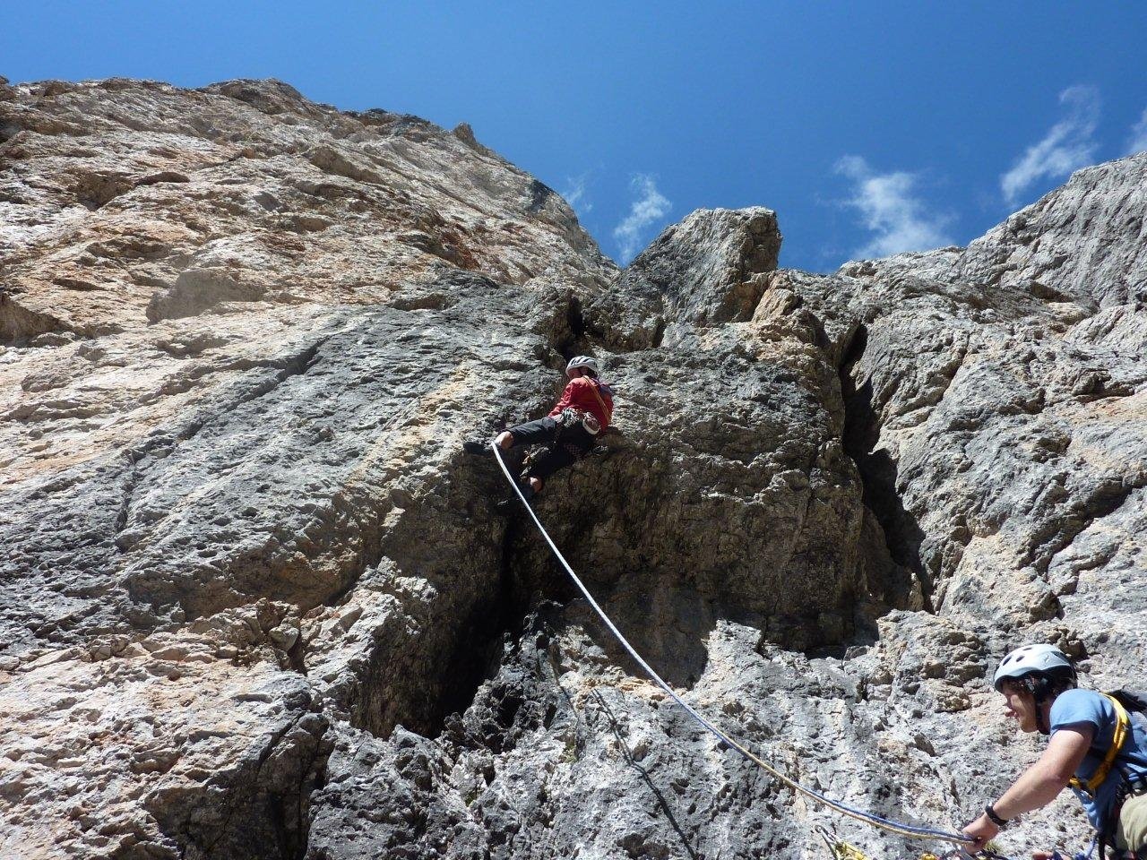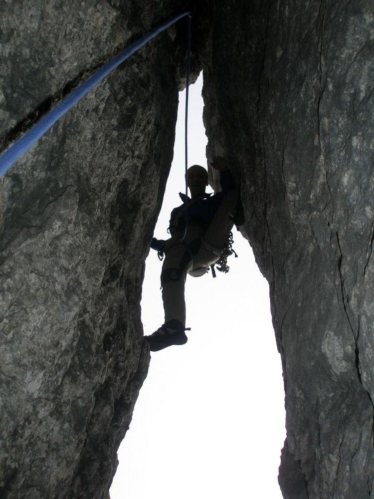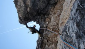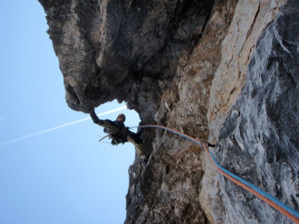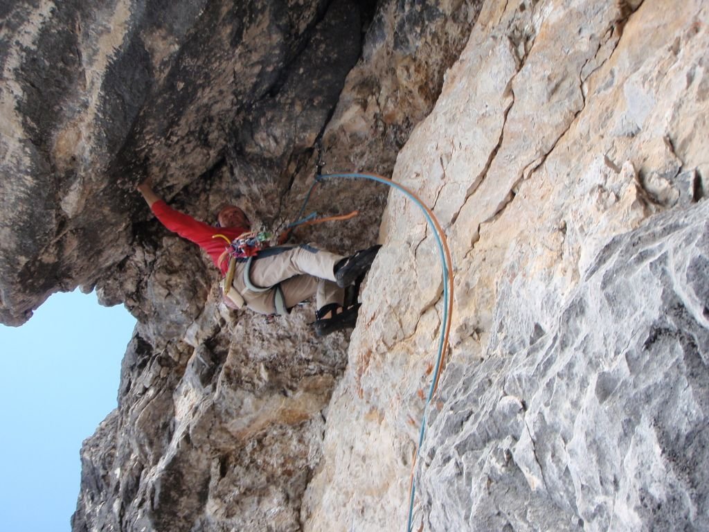 die Schlüsselstelle in der siebten Seillänge kann auch über eine kleine Rampe (1BH) umgangen werden. In der 6. Seillänge Zwischenstand möglich.