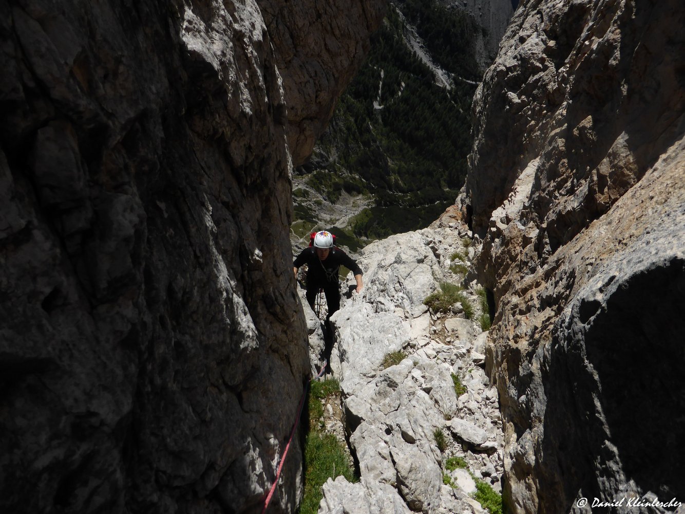 Laserzwand abbiegen und über Steig zur Westschlucht (Alternative – „Rudl-Eller-Weg“). Ca. 50 Meter über die Schlucht