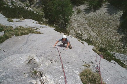 Schöne und nicht allzu lange Sportkletterei von den Schwabspezialisten G. Graber u. K. u. T. Richter. Das Finale wartet vor dem allerletzten Bolt in der 5. SL., aber keine Angst, die Tour ist bei den schweren Stellen gut mit BH gesichert. Die Stelle kann gut A0 gemacht werden. Einzig im leichten Gelände (bis 6+) sollte man sicher unterwegs sein. Der Fels ist bis auf wenige Stellen durchwegs fest (Foto). Auf den Standplätzen liegen manchmal lose Steine (Achtung bei Nachsteigern). Wer hier mit Wasserrillen à la Wetzsteinplatte rechnet wird aber enttäuscht sein, denn es dominieren Platten (Foto) wie in der Hundswand. Zusammenfassend eine schöne und lohnende Tour.