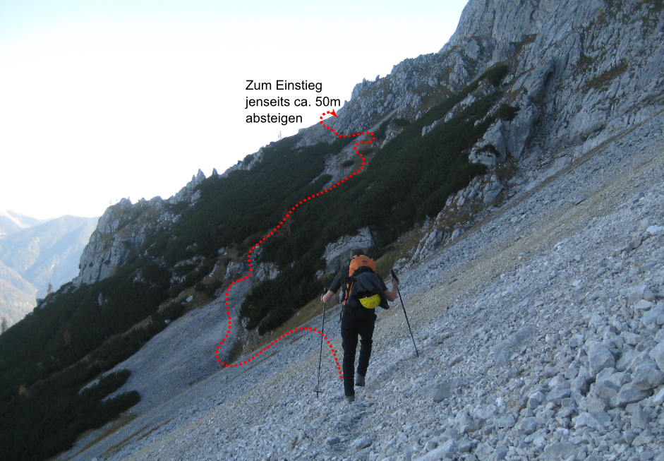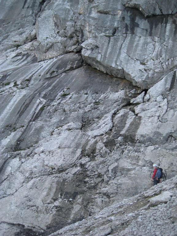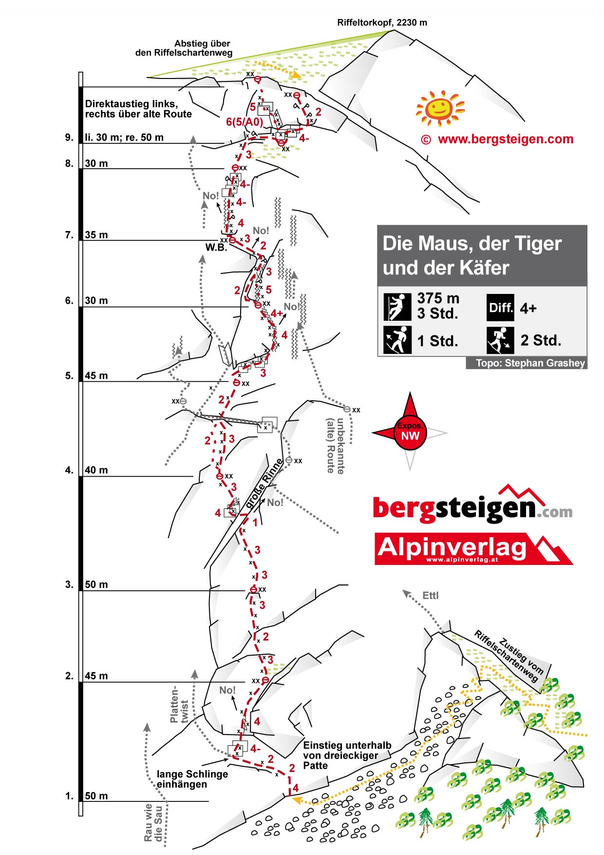 durch die die Riffelriß östlich begleitende Gratrippe, links durch die Nordkante. Der Einstieg befindet sich