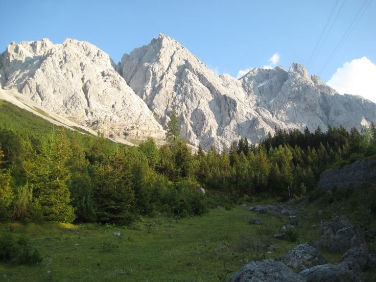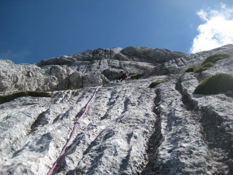 Sehr schöne Platten und Wasserrillenkletterei in überwiegend festem, sehr rauem Wettersteinkalk.