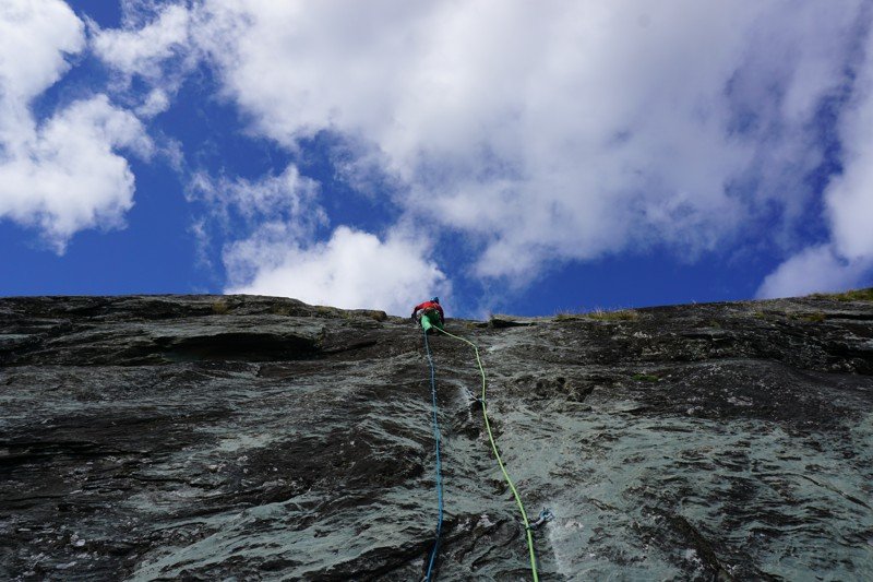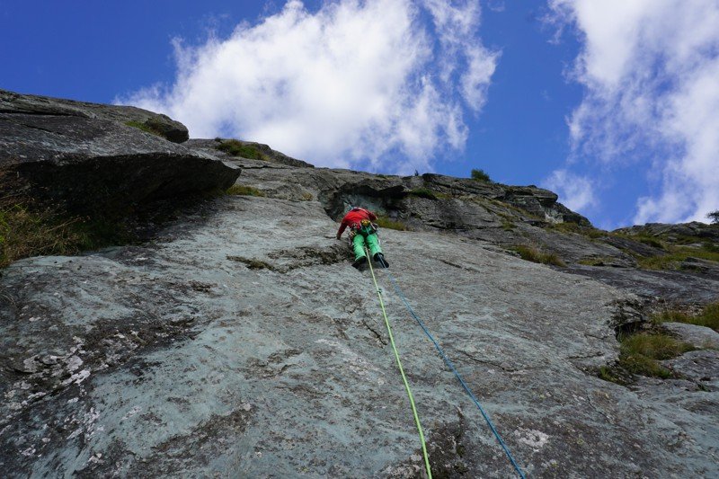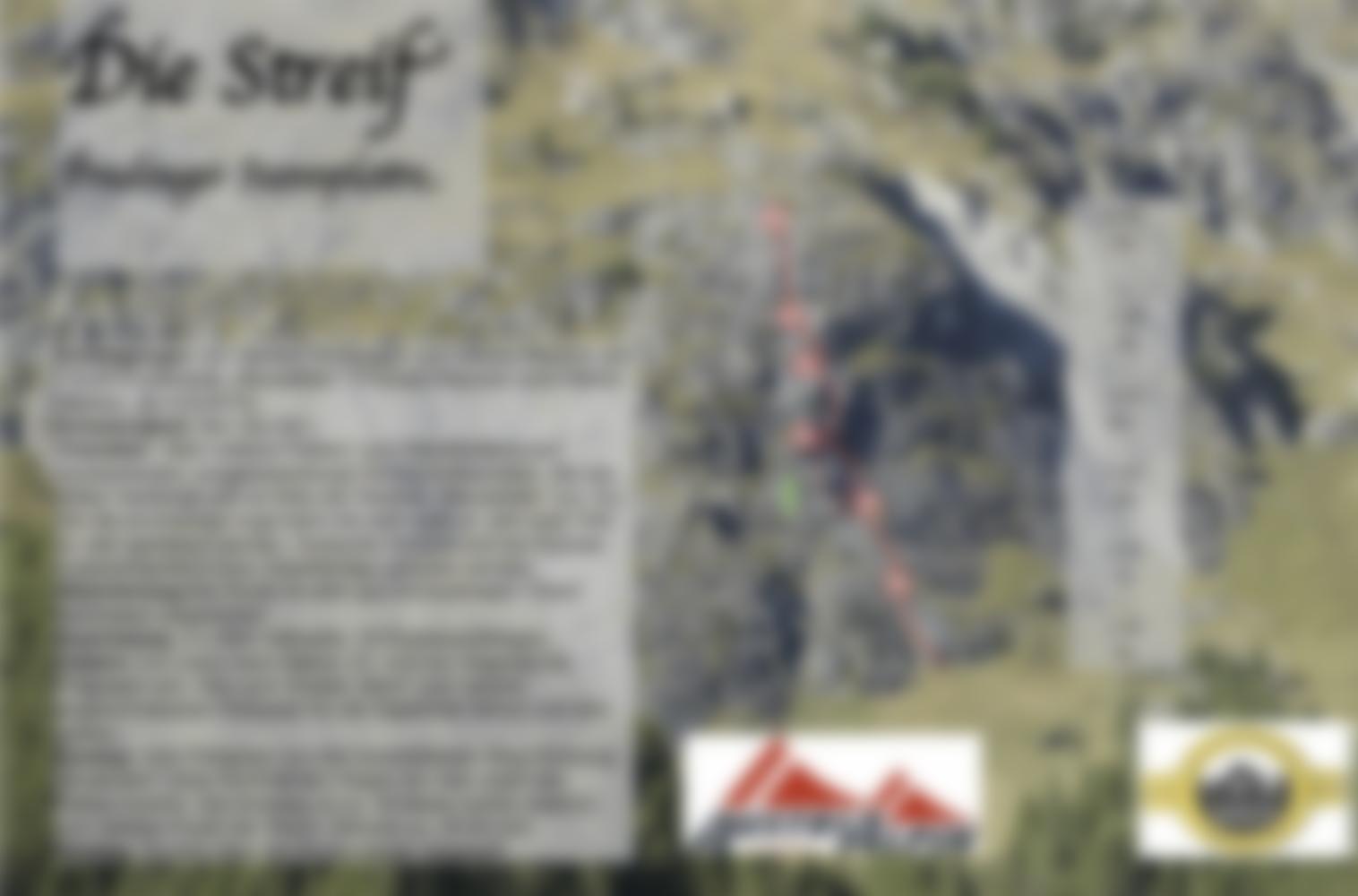 Nach der ersten Seillänge (zuerst Riss dann Platte), gelangt man auf ein Grasband. Nach der nächsten noch etwas leichteren Länge kann man sich entscheiden, ob man links in die Mausefalle klettert (spaßig leichter Kamin, dann Wand) oder die Streif gerade rauf folgt. Die Schlüssellänge beginnt mit einer Schuppe, die etwas mit Vorsicht geklettert werden sollte um dann in die Platte zu wechseln, wo erstaunlich viele kleine Quarzknauern und Quarzleistchen hervorstehen und das emporklettern ermöglichen. Nach oben hin wird der Fels immer ausgewaschener und interessanter, bis es letztendlich in der sechsten Länge sehr flach wird und nun abgeseilt wird.