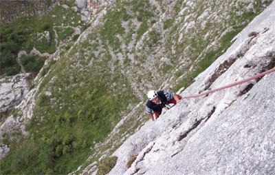 Nach wie vor sind die steilen Ausstiegslängen die anspruchsvollsten, in der ersten Länge ist der flache Piaz nach dem Überhang die technische Schlüßelstelle der Route.