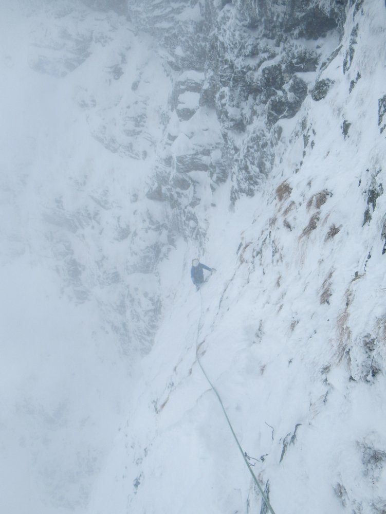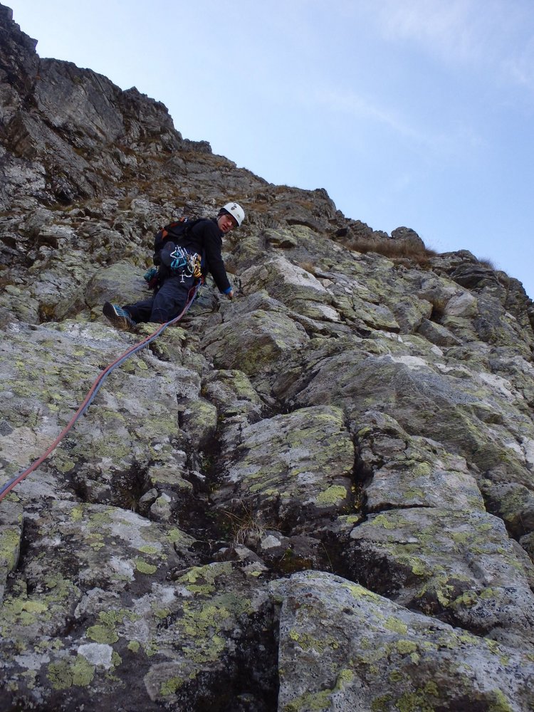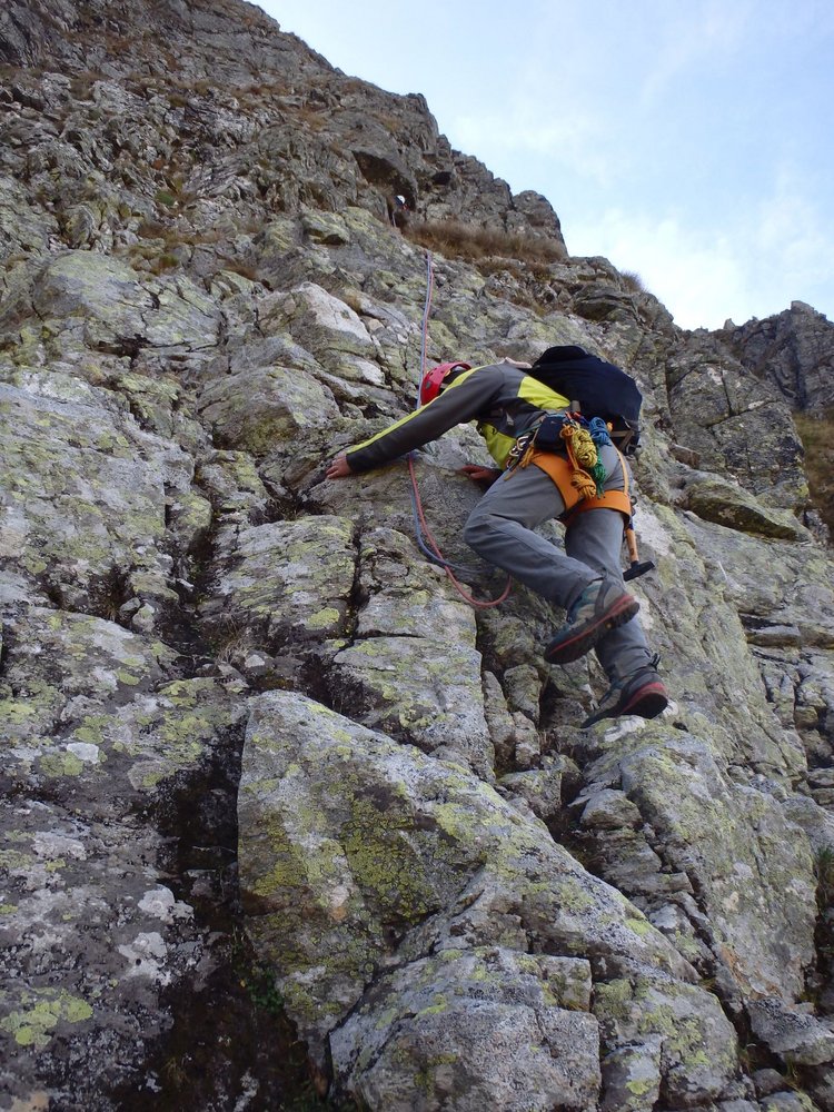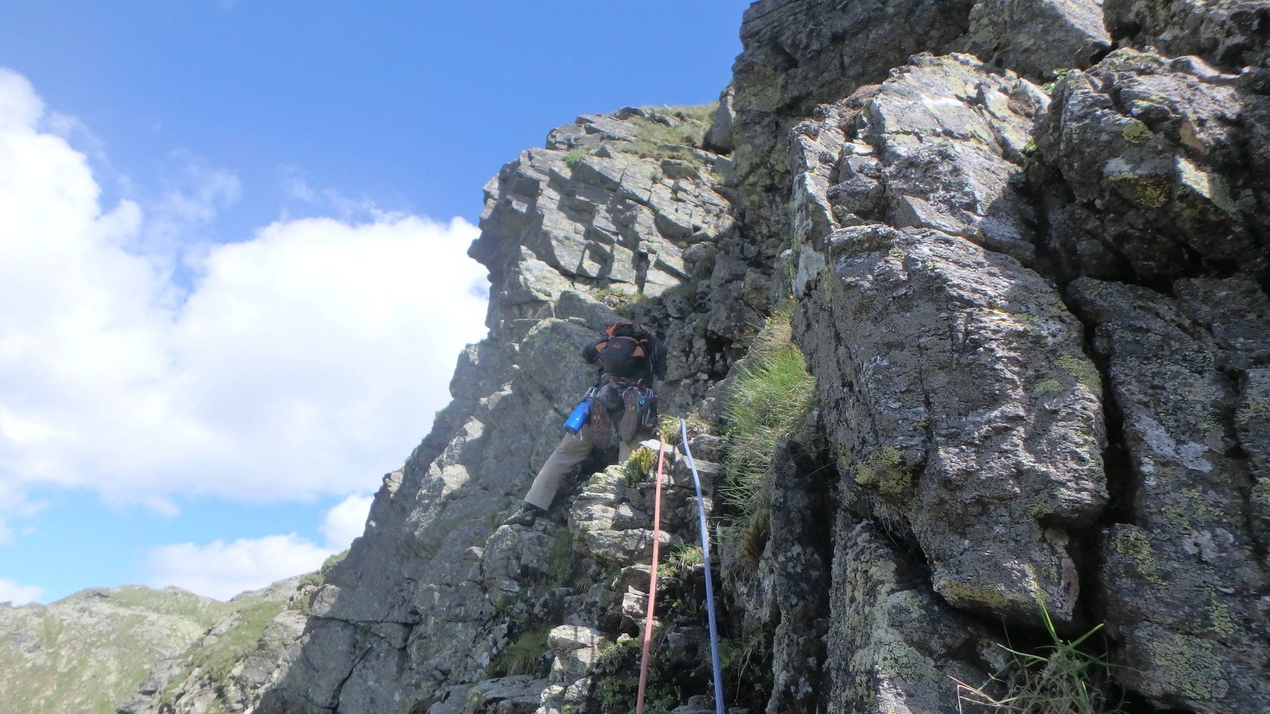 Den zentralen Pfeiler bis ans Ende, von hier linkshaltend durch eine ausgeprägte Rinne, gerade zum Gipfel.