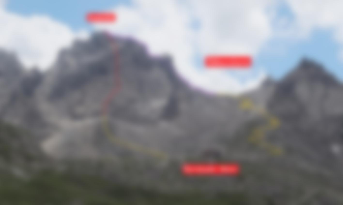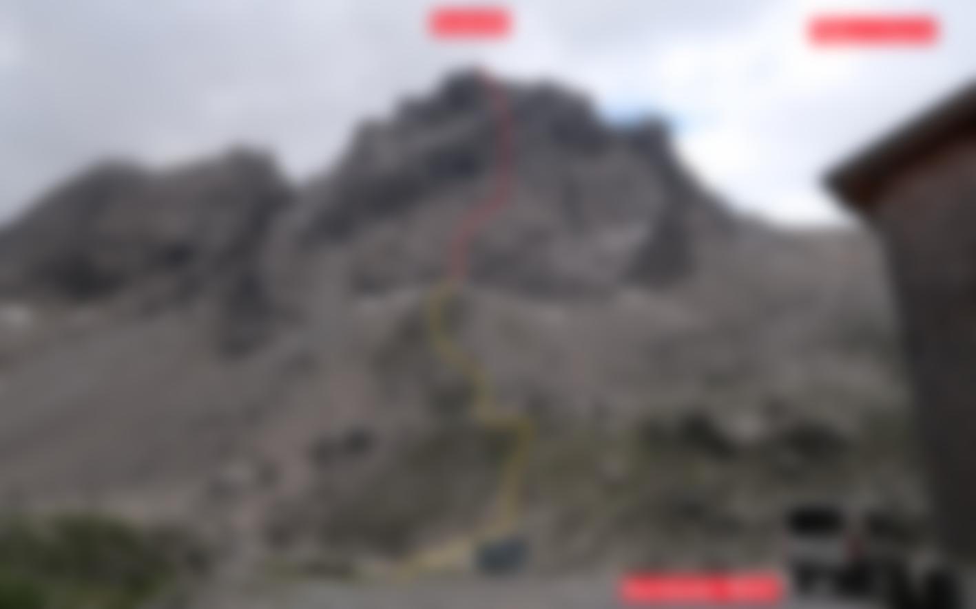 Von der Dolomiten Hütte hinauf zur Karlsbader Hütte. Von der Karlsbader Hütte zum See und über den kleinen Betonwall auf die Westseite des Sees. Gleich nach dem Betonwall zieht ein Pfad hinauf auf den Kamm mit Gras und Blöcken. Auf diesem Kamm nach links auf die Nordwand zu. Man sieht eine gelbe Punktmarkierung, der man entlang des Kammes und oben im Schutt bis zum Einstieg bei einem gelben Kreis folgt.