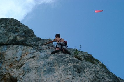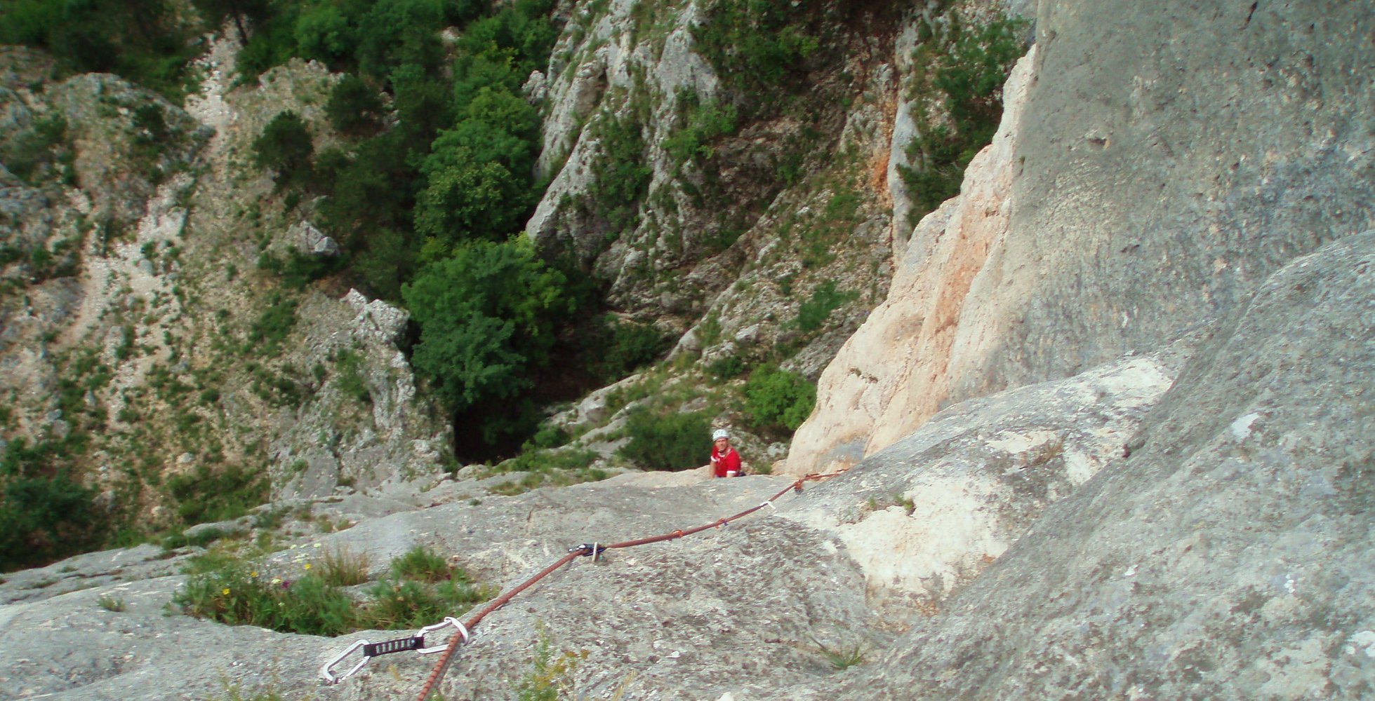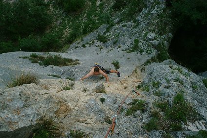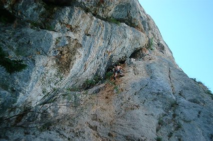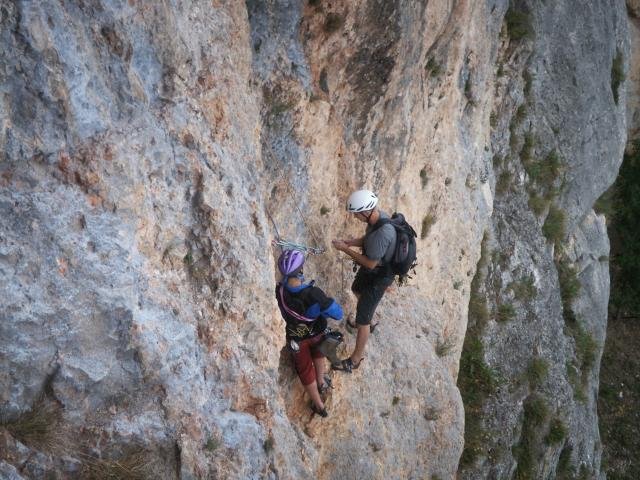 Von der ersten Kehre über den Milakklettergarten mit seinen eingefärbten Touren unter die Sonnenuhrwand. Nun auf Steigspuren aufwärts, teilweise mit alten Seilen versichert, bis zu einer Scharte bei Felskopf, hier beginnt der Einstiegsgrat zum ersten Stand.