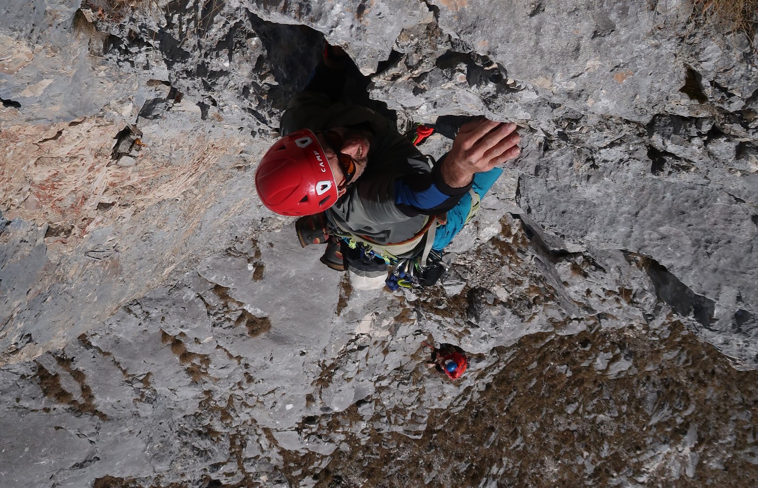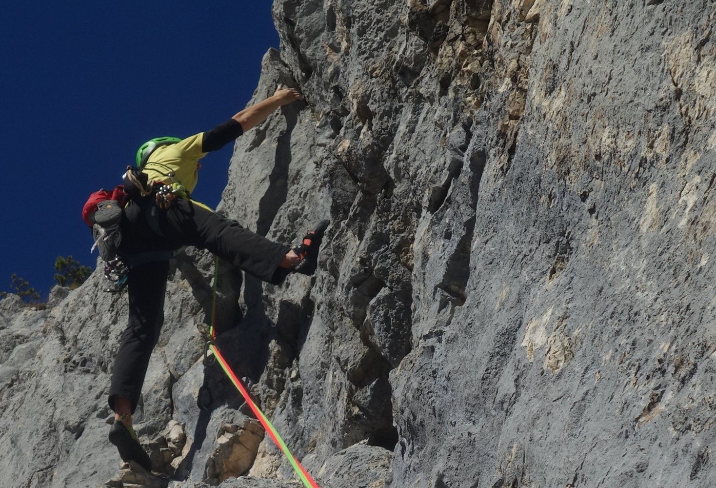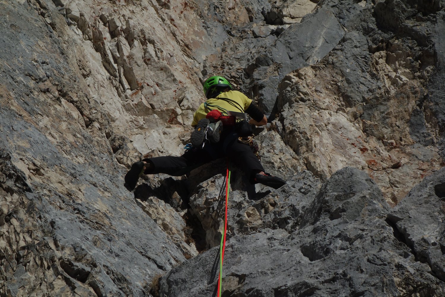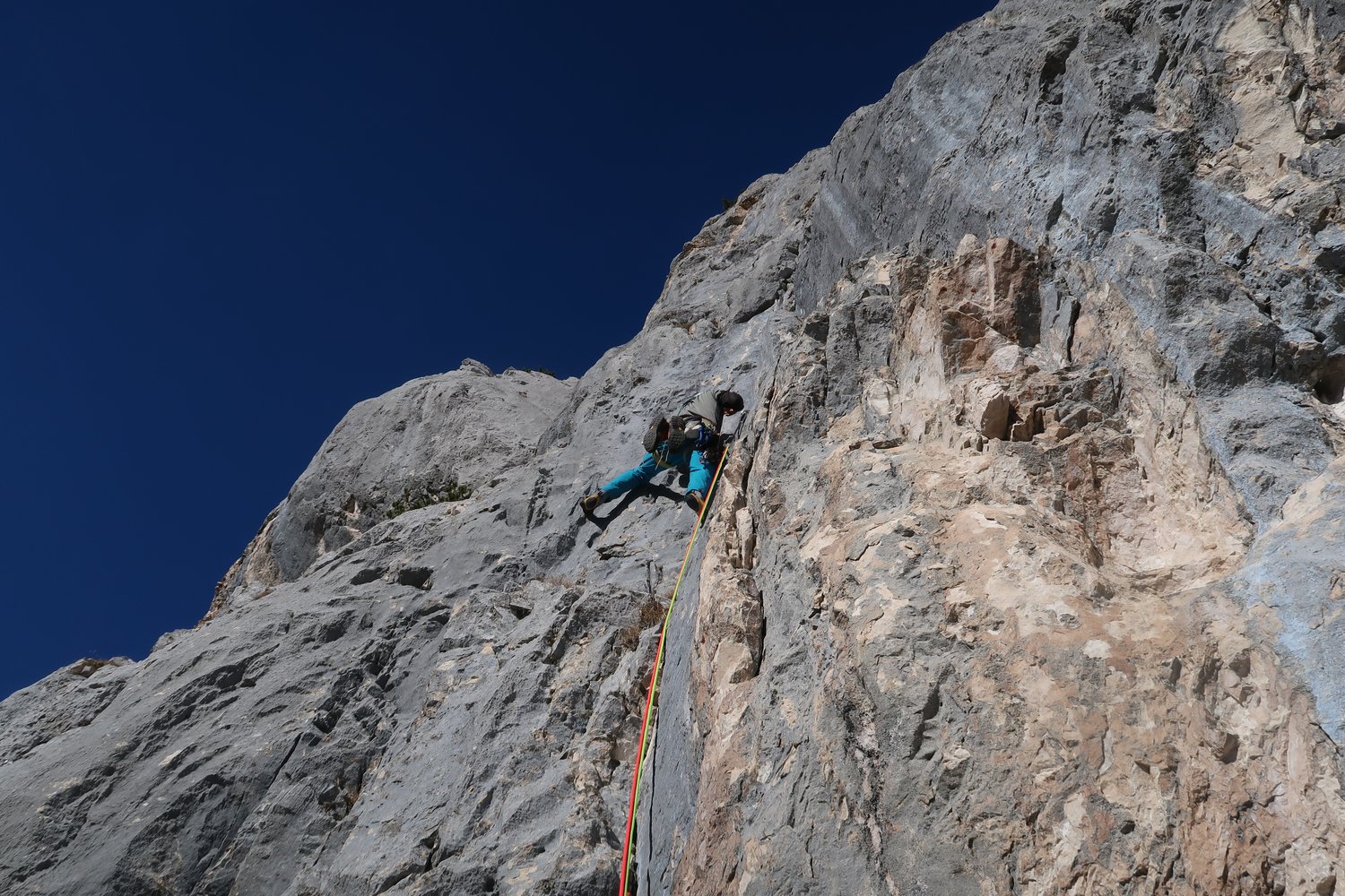 Übliche Alpinkletterausrüstung, 2 x 60 m Seil und Helm.