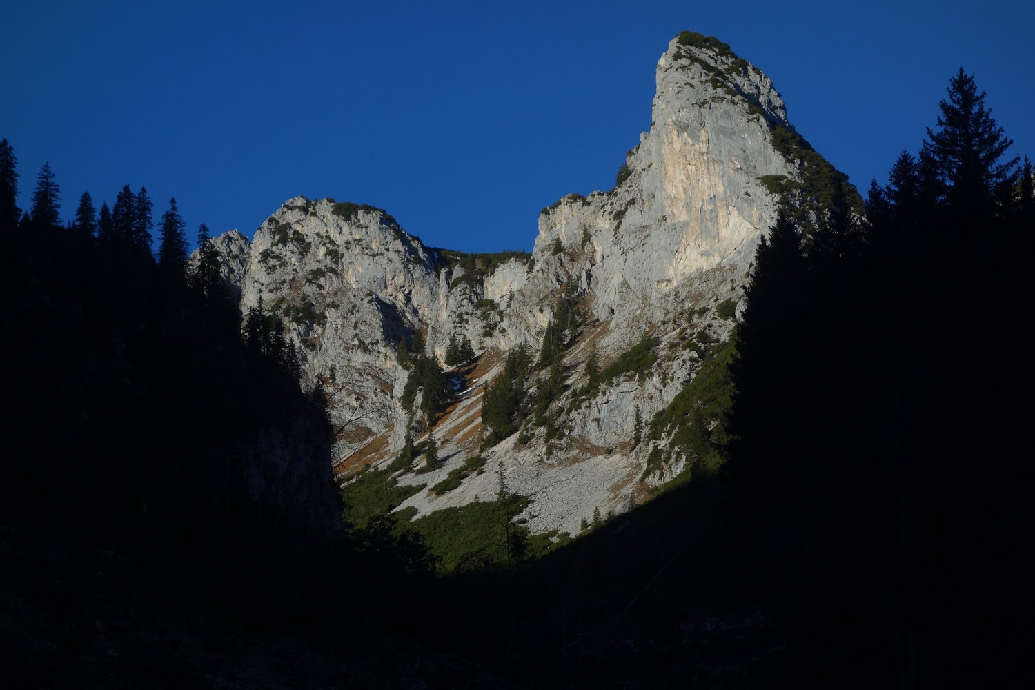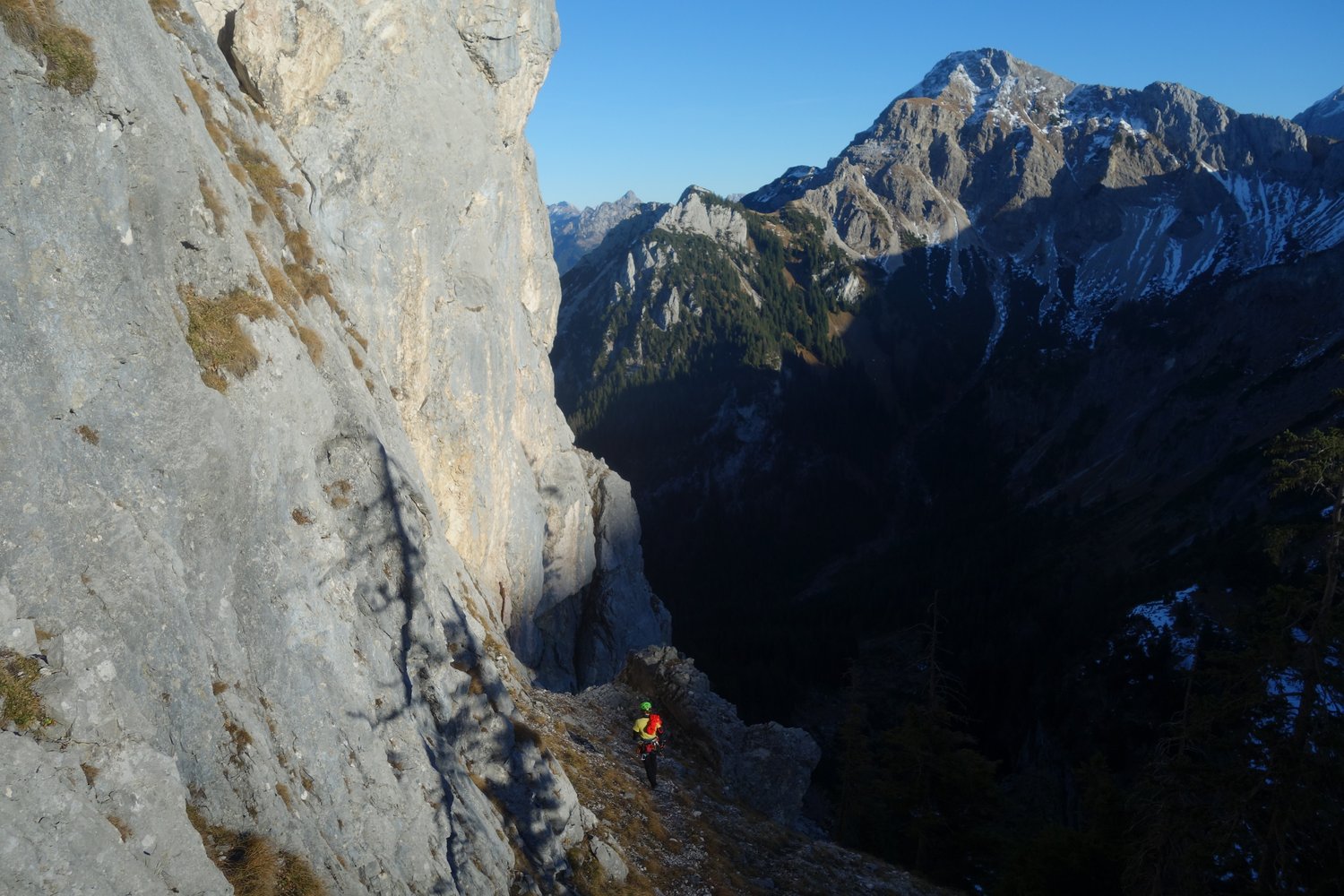 Vom Gipfel den schrofigen Grat Richtung Seebenspitze (Südwesten) auf dem Weg des geringsten Widerstands absteigen bis in eine Scharte vor einem gelben Steilaufschwung. Ausgesetzt links auf die Südseite des Grates (2 BH) und auf Band horizontal bis zum Abseilstand queren. 1 x 50 m abseilen und auf Steigspuren am schrofigen Wandfuß entlang zum Einstieg (20-30 Minuten). Ein schöner (aber im Herbst schon schattiger) Wiesenbummel und eine flotte Radlabfahrt - aber natürlich nur im erlaubten Zeitraum - runden den Tag ab.