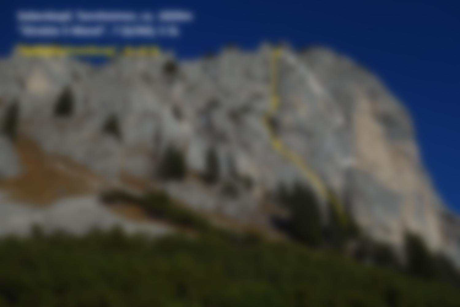 Da ein großes Routenwirrwarr in der Wand herrscht und an manchen Ständen bis zu vier Routen zusammenkommen, ist die Orientierung nicht immer ganz einfach. Die "Südverschneidung" lässt sich im Anschluss gut in zwei 60-Meter Seillängen klettern, links gibt es noch die Bohrhakenroute Ultima Ratio (6+). Das Topo bzw. Wandbild mitnehmen!