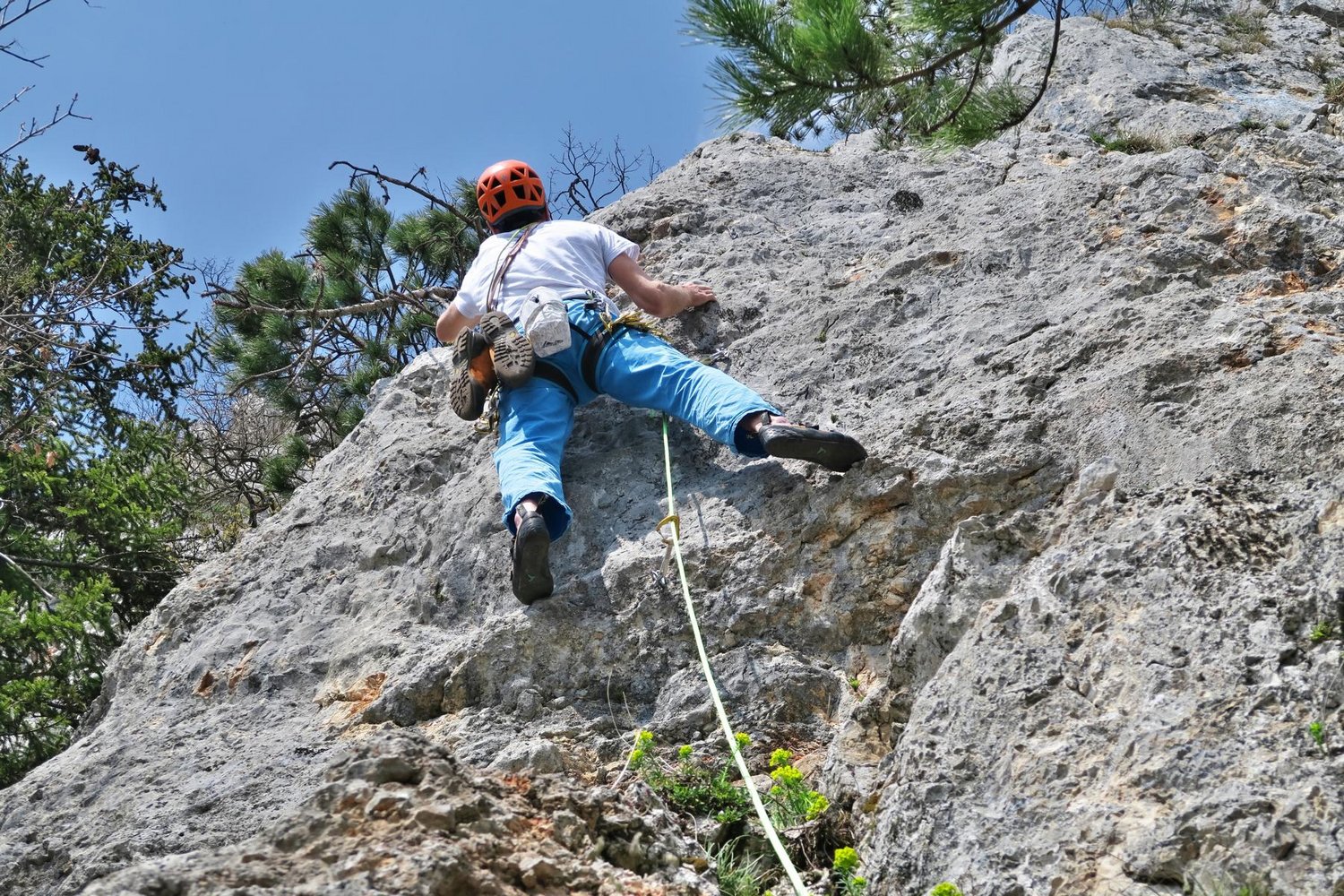 50 m Einfachseil, 12 Express, 2 Bandschlingen und unbedingt Helm!