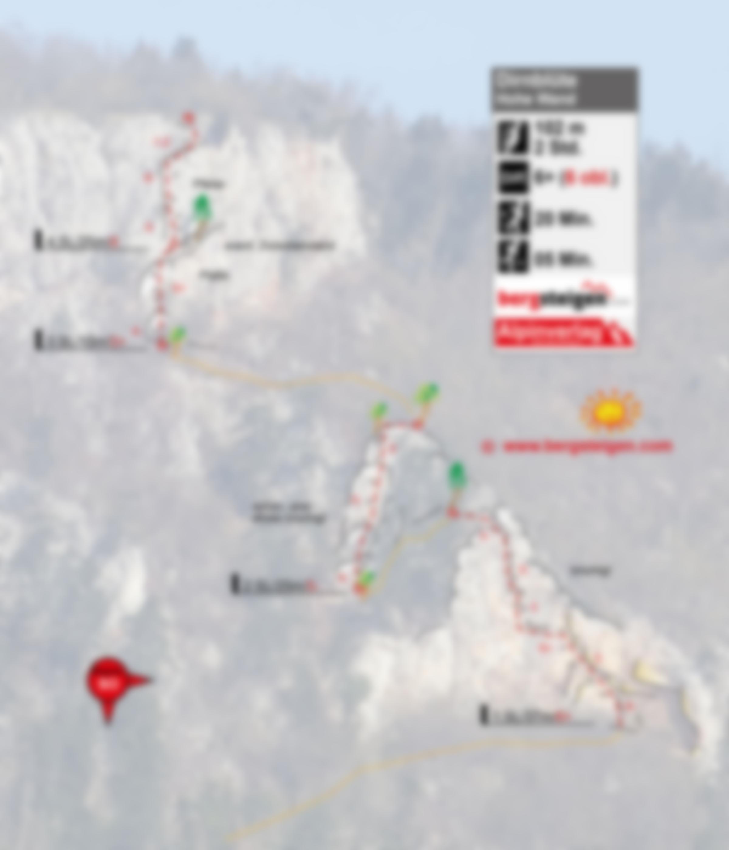 Vom Auto über den Beschilderten Hanselsteig (lange Leiter) absteigen und am Ende der Wand dem Weg noch nach links weiter absteigen, bis dieser eine leichte Rechtskurve macht. Kurz davor auf unscheinbaren Steigspuren der Wand entlang aufsteigend queren, bis man zum Einstieg kommt.