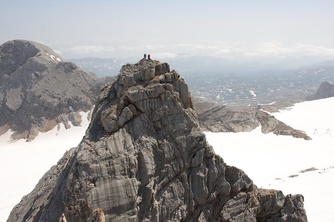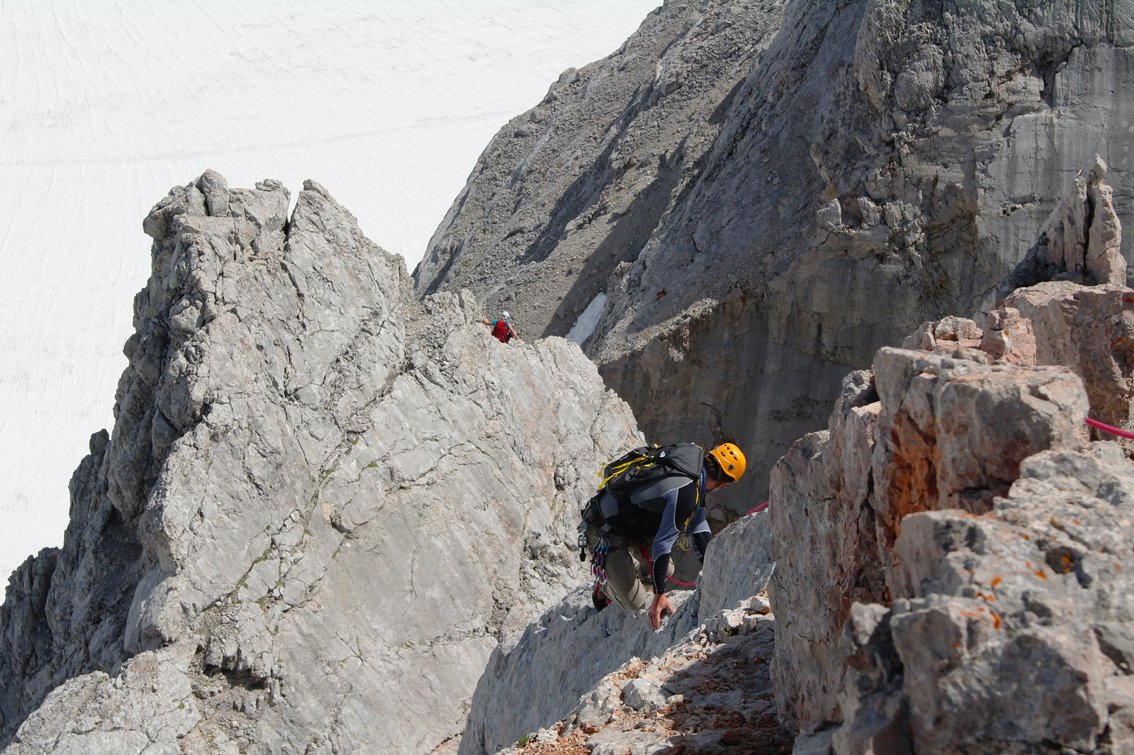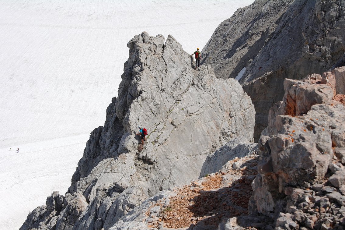Die Dirndl Überschreitung ist der leichte Top-Klassiker an der Südseite des Dachsteins. Die Tour verläuft meist auf dem Grat und hat einige schöne, ausgesetzte Passagen. Während der Kletterei sieht man immer den schrofen Dachstein und als Kontrast die saftigen Wiesen weit unten im Tal. Die auch bei vielen Bergführern beliebte Führungstour wird nahe der Seethalerhütte begonnen und ist recht gut mit Bohrhaken gesichert. Neben der schönen Kletterei sind auch zwei recht luftige Abseilpassagen - zwischen den beiden Dirndln und am Ende die Abseilpiste - zu bewältigen. Gesamt ein tolles alpines Abenteuer mitten in der schönen Gletscherwelt, welches durch die Seilbahn aber ohne langen Zustieg auskommt.