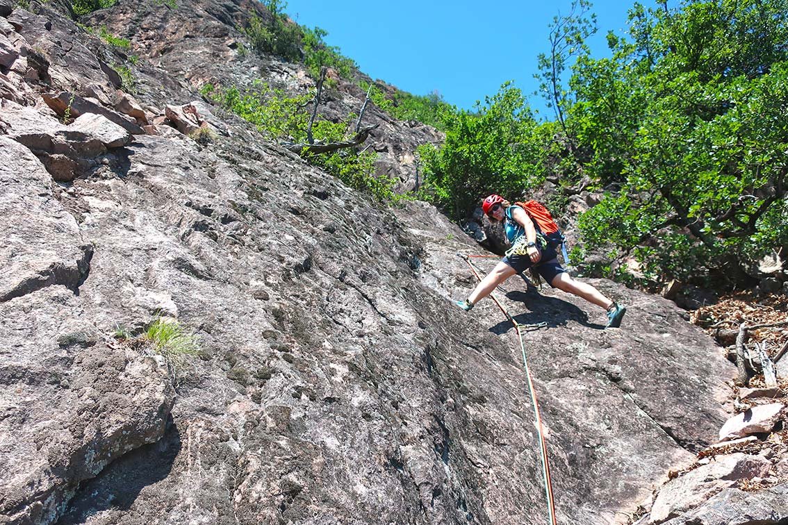 6. SL (5/5+ bzw. 5a+, 35 m, 10BH): Diese Seillänge führt in etwas einfacherer Kletterei links diagonal nach oben.