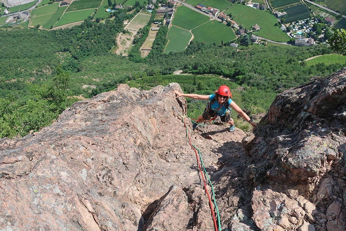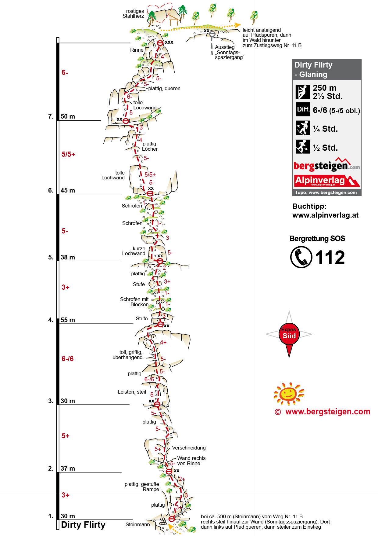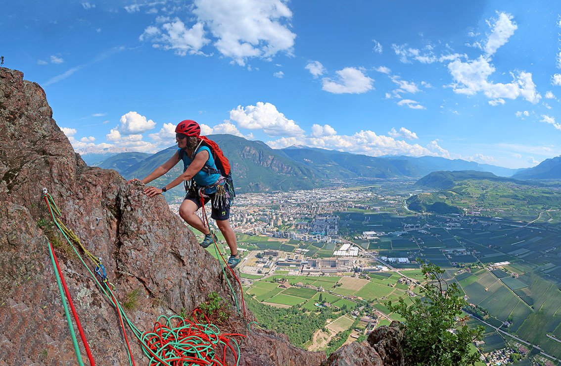 Die Dirty Flirty ist eine sehr gute, nicht allzu schwere Route oberhalb von Bozen - perfekt für ein romantisches Kletterdate! Vom Tal aus betrachtet erscheint die rötliche Porphyr-Wand für Kletterer von geringem Interesse. Erst wenn man Seillänge für Seillänge klettert, erkennt man die Vielseitigkeit dieser Wand. Die Route verläuft im linken Wandbereich, nicht allzu weit von der Route Sonntagsspaziergang entfernt. Dieser Bereich ist von einer langgezogenen Schulter zweigeteilt. Die ersten drei Seillängen führen durch steile Platten auf die Schulter, welche mit zwei Verbindungslängen (mit etwas Gehgelände) überwunden wird. Danach folgen zwei weitere Seillängen an sehr schönen Platten in bester Genusskletterei zum Ausstieg. Bei der Tour beginnt man quasi beim Ausstieg und steigt vom Gasthof Noafer zum Einstieg ab - wenn man auch noch den Sonntagsspaziergang dran hängt, kommt ein perfekt ausgefüllter Porphyr-Klettertag heraus!