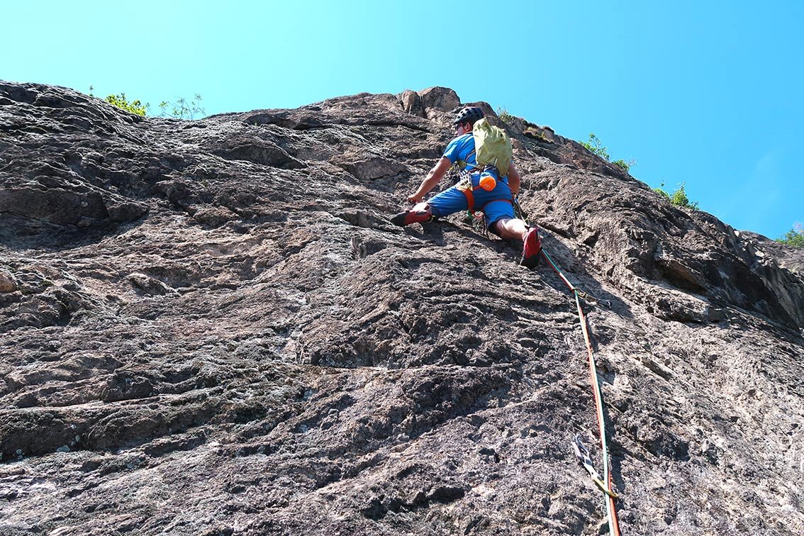 2. SL (5+ bzw. 5b, 35 m, 10BH): Vom Stand geht es links haltend über eine markante Kante und dann durch eine steile Verschneidung nach oben. Hier wechselt das Terrain zu anliegenden Platten, welche in wunderschöner Plaisirkletterei zum nächsten Stand führen.