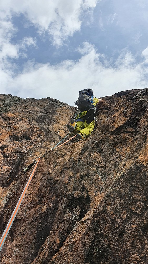 Normale Mehrseilen-Ausrüstung, Helm. Es genügen 12 Expressschlingen. Zuzüglich zur klassischen „Multipitchausrüstung“ ist es empfehlenswert, einige Schlingen mitzuführen, um die eine oder andere Sicherung zu verlängern und in den leichten Seillängen an Büschen mit Schlingen Zwischensicherungen zu machen.