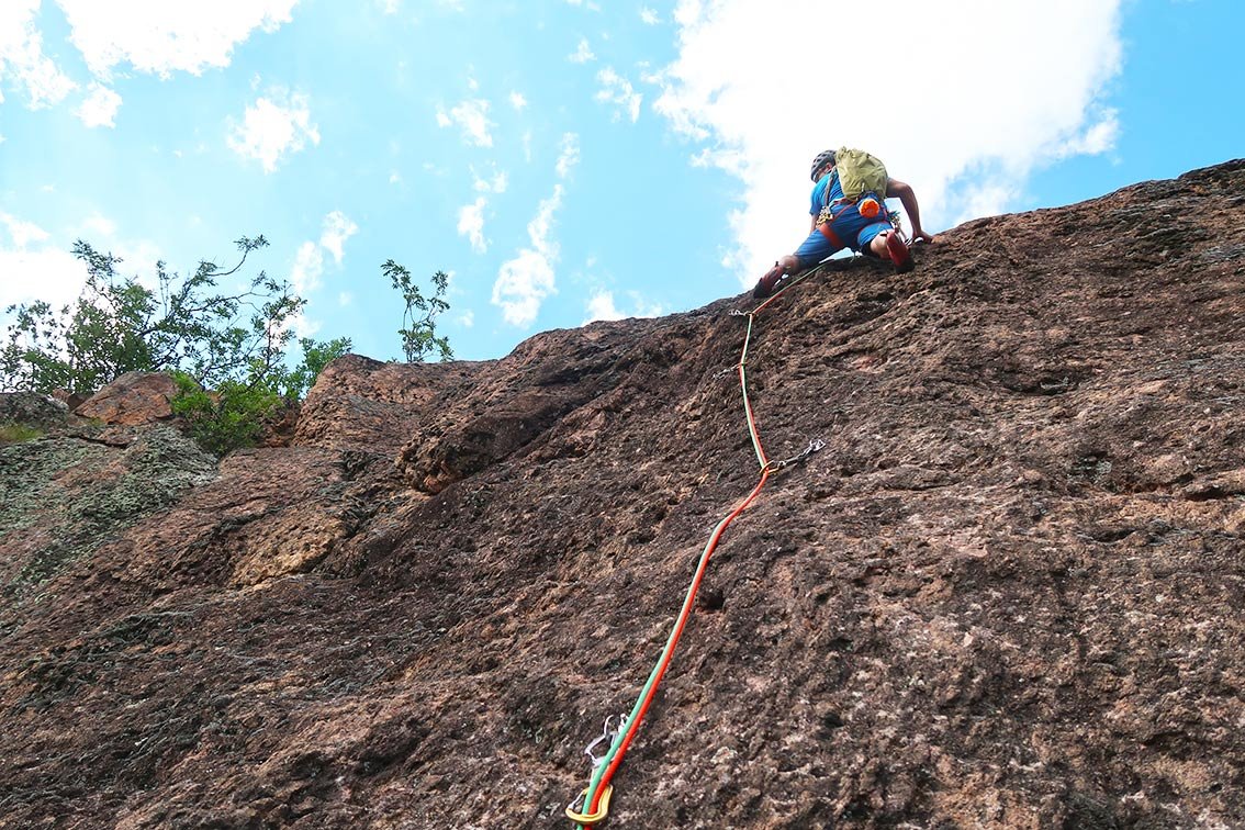 Die Route ist mit Bohrhaken sehr gut abgesichert. Es genügen 12 Expressschlingen. Die Erstbegeher haben wirklich sehr gute Arbeit geleistet!