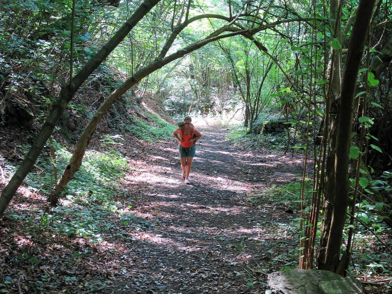 Nach dem letzten Haus über die Bahn und auf dem Weg im Talgrund in den Wald hinein. Nach wenigen Minuten führt der Weg über Steinterrassen, kurz danach sieht man rechts eine markante Felswand. Der Einstieg ist bei dem ebenfalls markanten, engen Kamin.