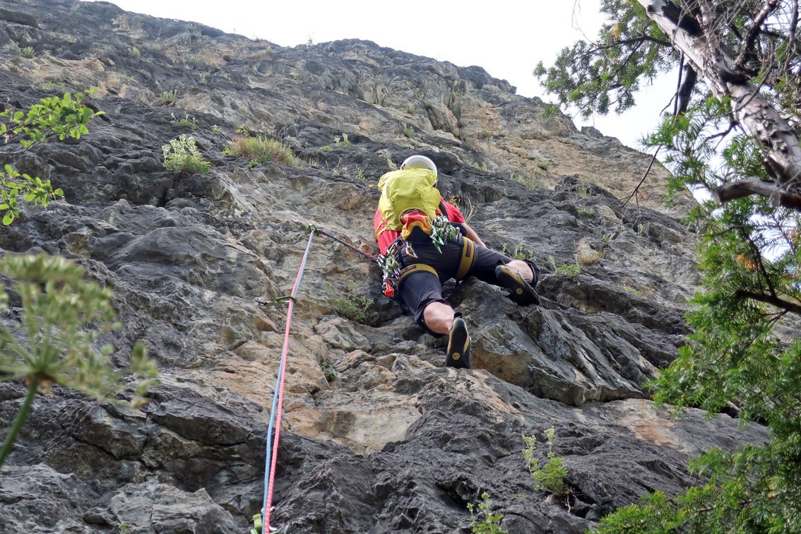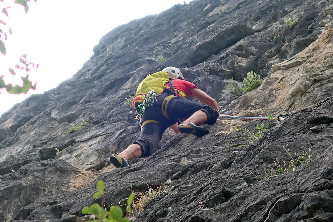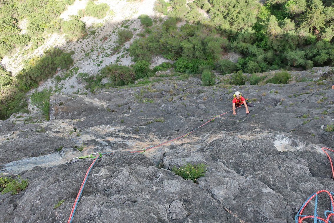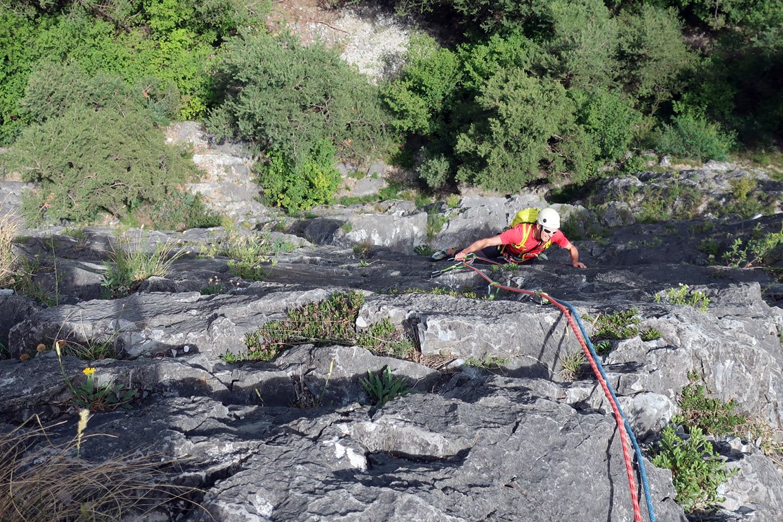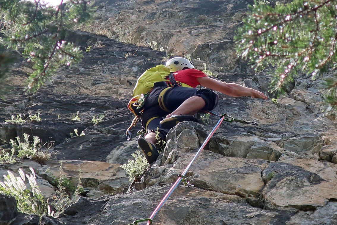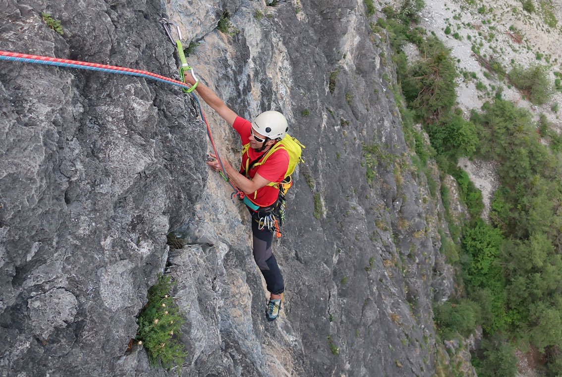 1 x 60 m Einfachseil, 15 Expressschlingen und Helm.