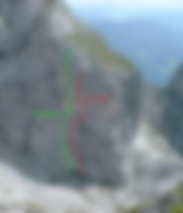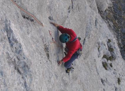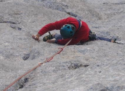 Super Platten.- und teilweise überhängende Kletterei. Die IX- Seillänge (früher VII, A0) kann auch jetzt VII,A0 geklettert werden, nur sind jezt Bohrhaken gesetzt.