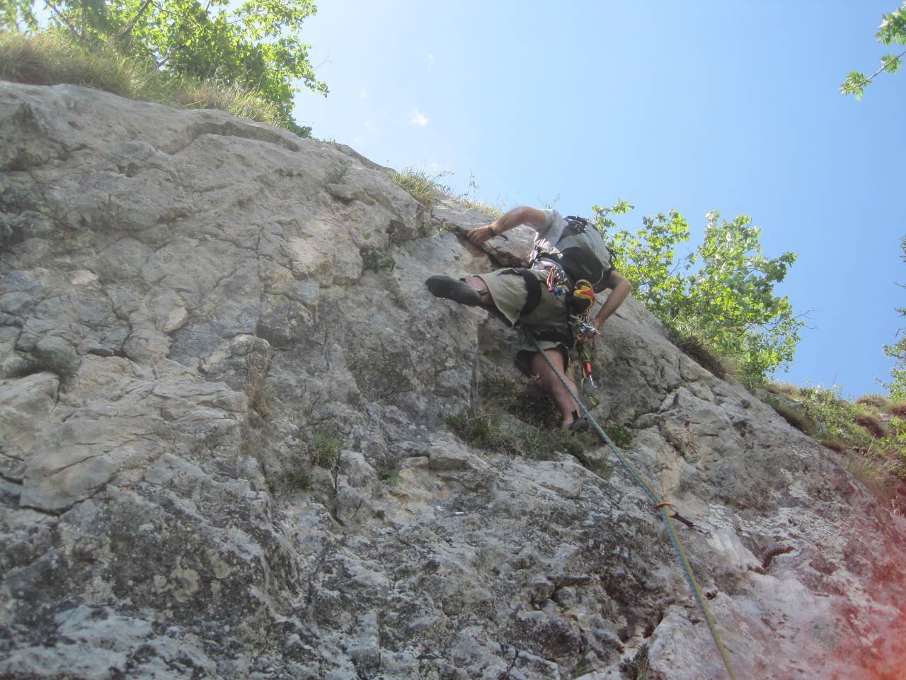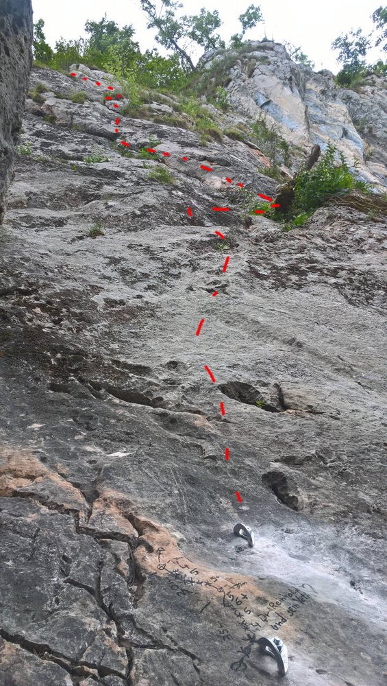 Anfangs leichte Querung über Platten(4), hiernach steil nach oben einem Riss folgend(5) um wiederum über eine Platten/Riss Kombination(5) bis unterhalb des Schlüsselpunktes zu kommen, welcher sich direkt unterhalb einer kleinen Nase(6+) befindet. Hier ist etwas mentale Stärke gefragt, da trotz guter Griffe, es einem die Schwerkraft nicht leicht macht. Nach überwinden der Schlüsselstelle etwa 5m nach oben und nach Rechts ins Gras queren(5), wo man den Standplatz findet.