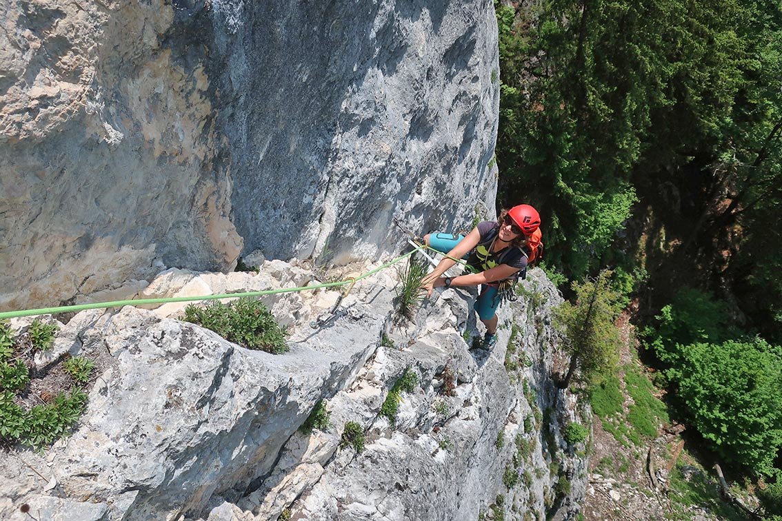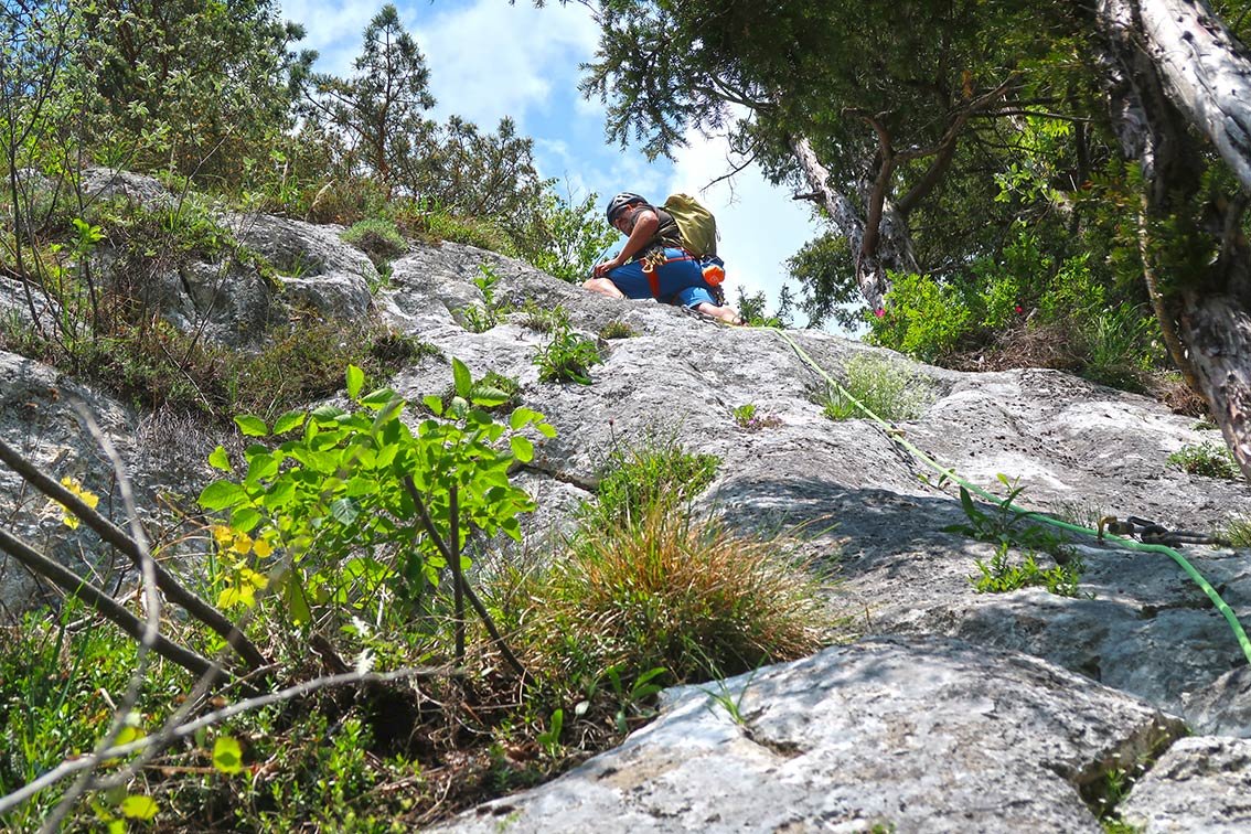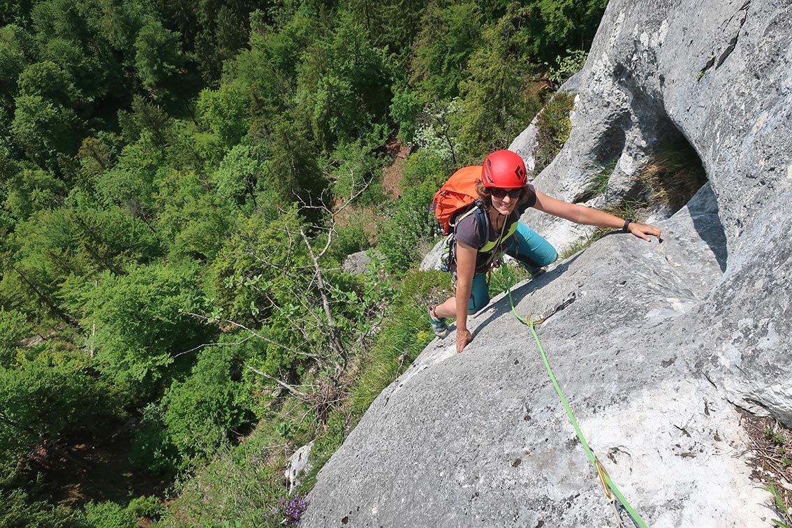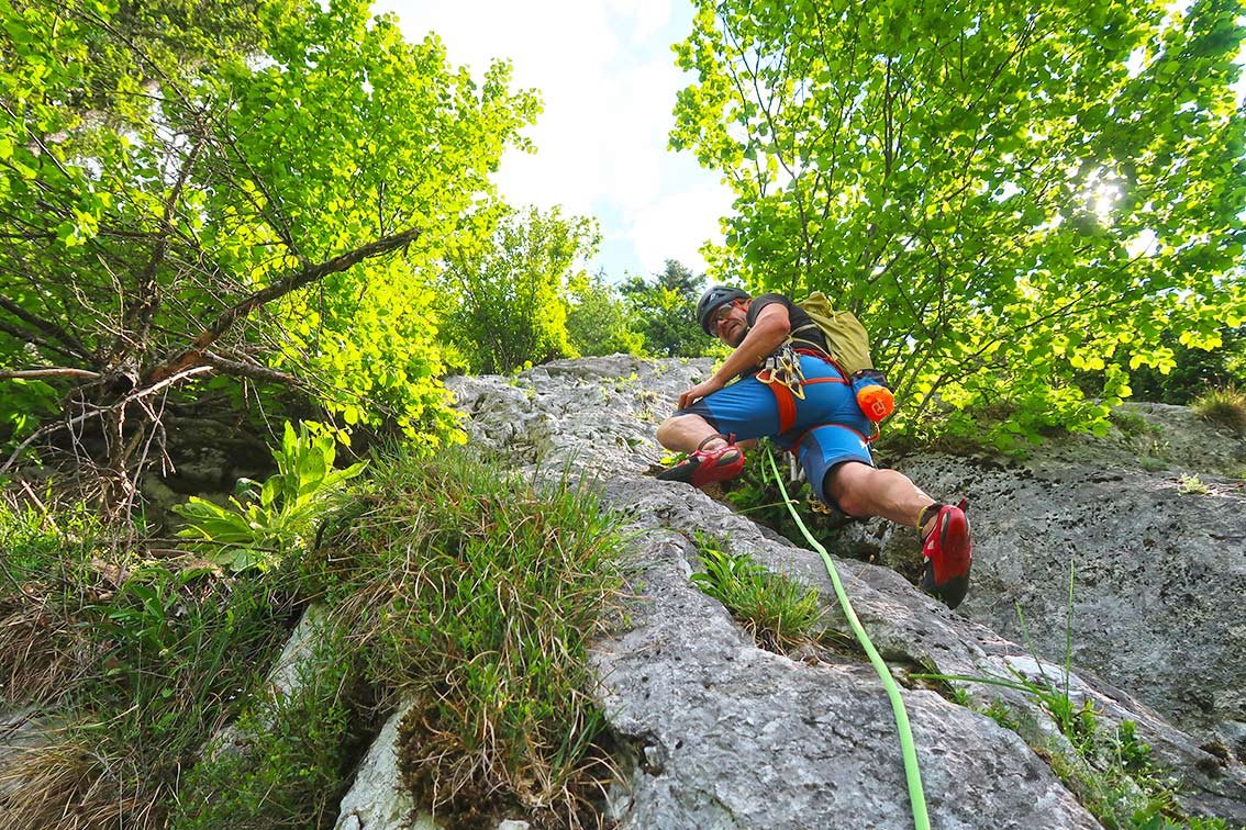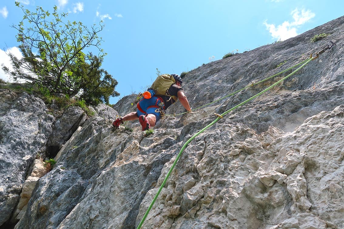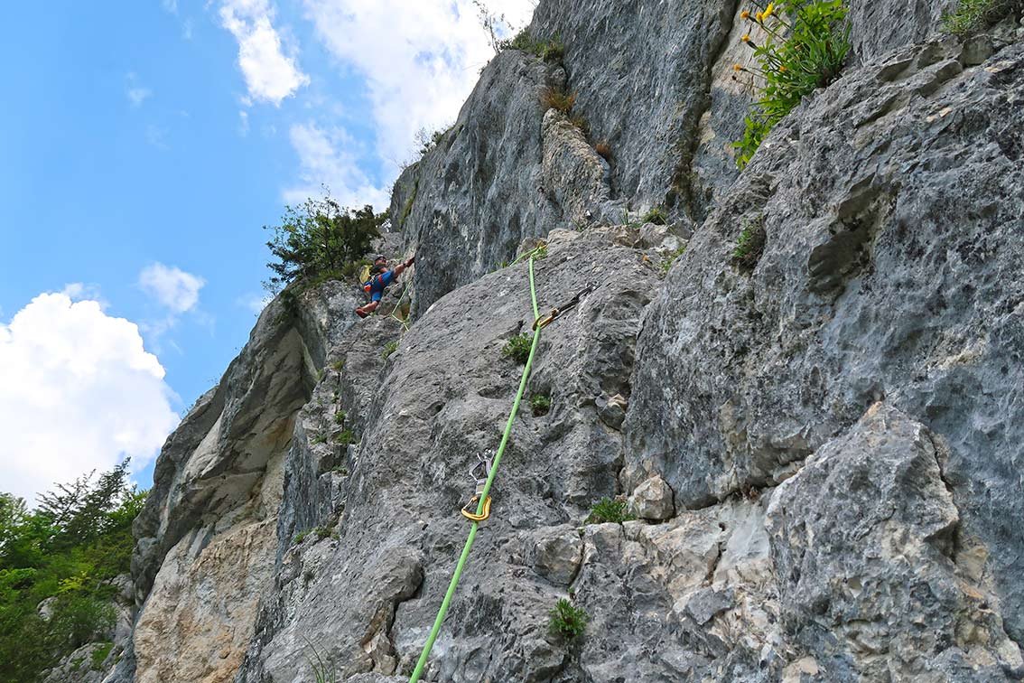 1 x 50 m Einfachseil, 13 Expressschlingen und Helm.