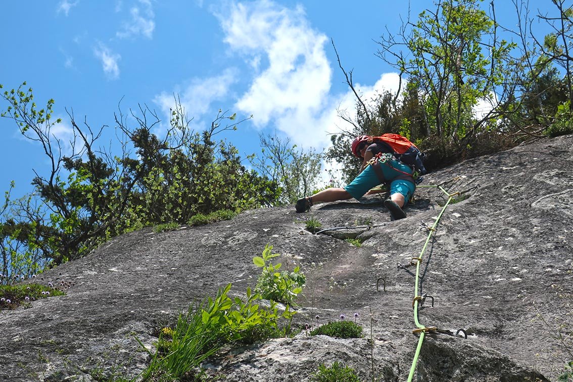 Zuerst auf Pfadspuren nach rechts. Ab dem Irma la Douce Ausstieg ist der Abstieg mit roten Punkten markiert, bei Nässe aber heikel. Eine Steilstufe ist mit einem Stahlseil gesichert. Nach dieser Steilstufe erreicht man den Wanderweg auf dem man weiter absteigt. Anm: Auf dem Felskamm nicht den roten Stangen, sondern der Punktmarkierung folgen (anfangs eher rechts). Dem Wanderweg nach rechts hinab zum Klettergarten folgen und von dort zurück zum Parkplatz.