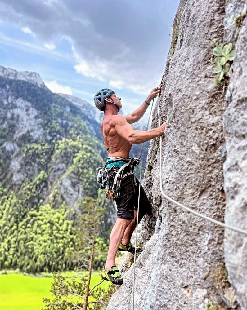 2 x 50 m Doppelseil, 14 Expressschlingen und Helm.