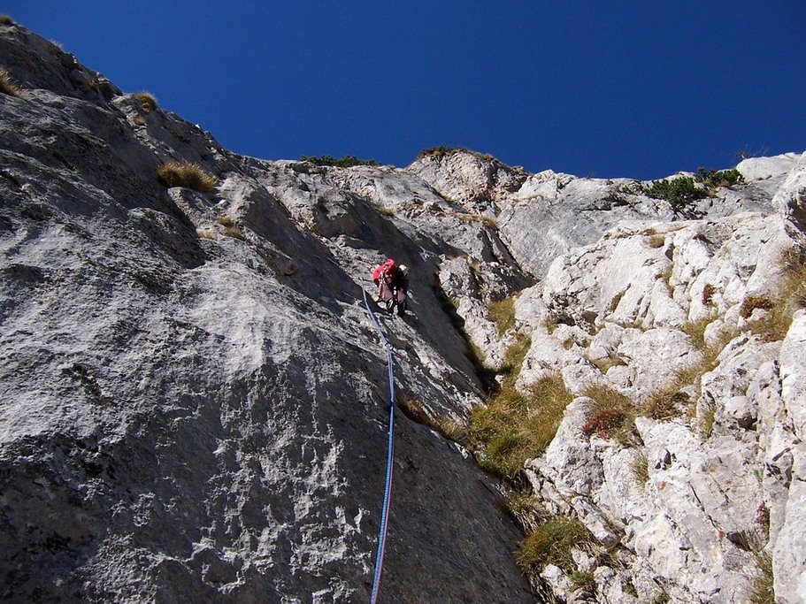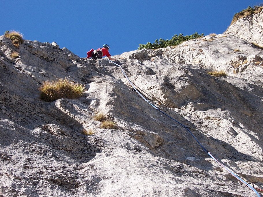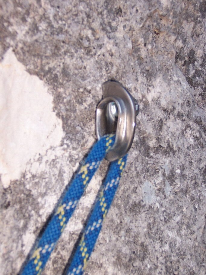 Mit HSA M10 gut, in der Schlüsselpassage sehr gut gesichert. Für die Abseilstellen wurden spezielle Stubai-Laschen verwendet.