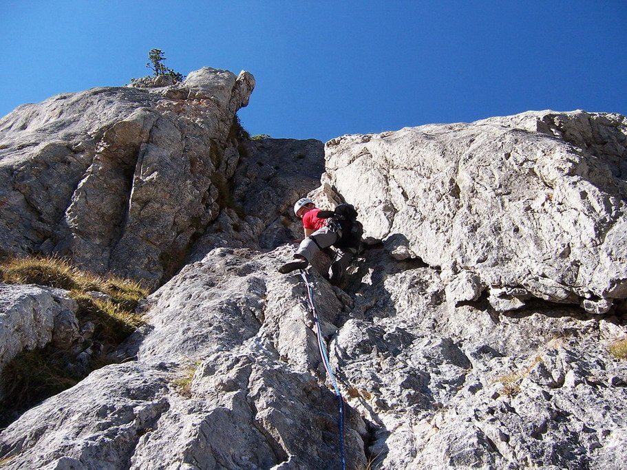 3 x abseilen über die Tour, oder vom letzten Stand aufwärts zu Fichte und von dort in östliche Richtung ins Stangenkar und zurück zum Einstieg Stangenkar (1-2) - Trittsicherheit erforderlich! Jeweils ca. 20 Min. zum Einstieg.