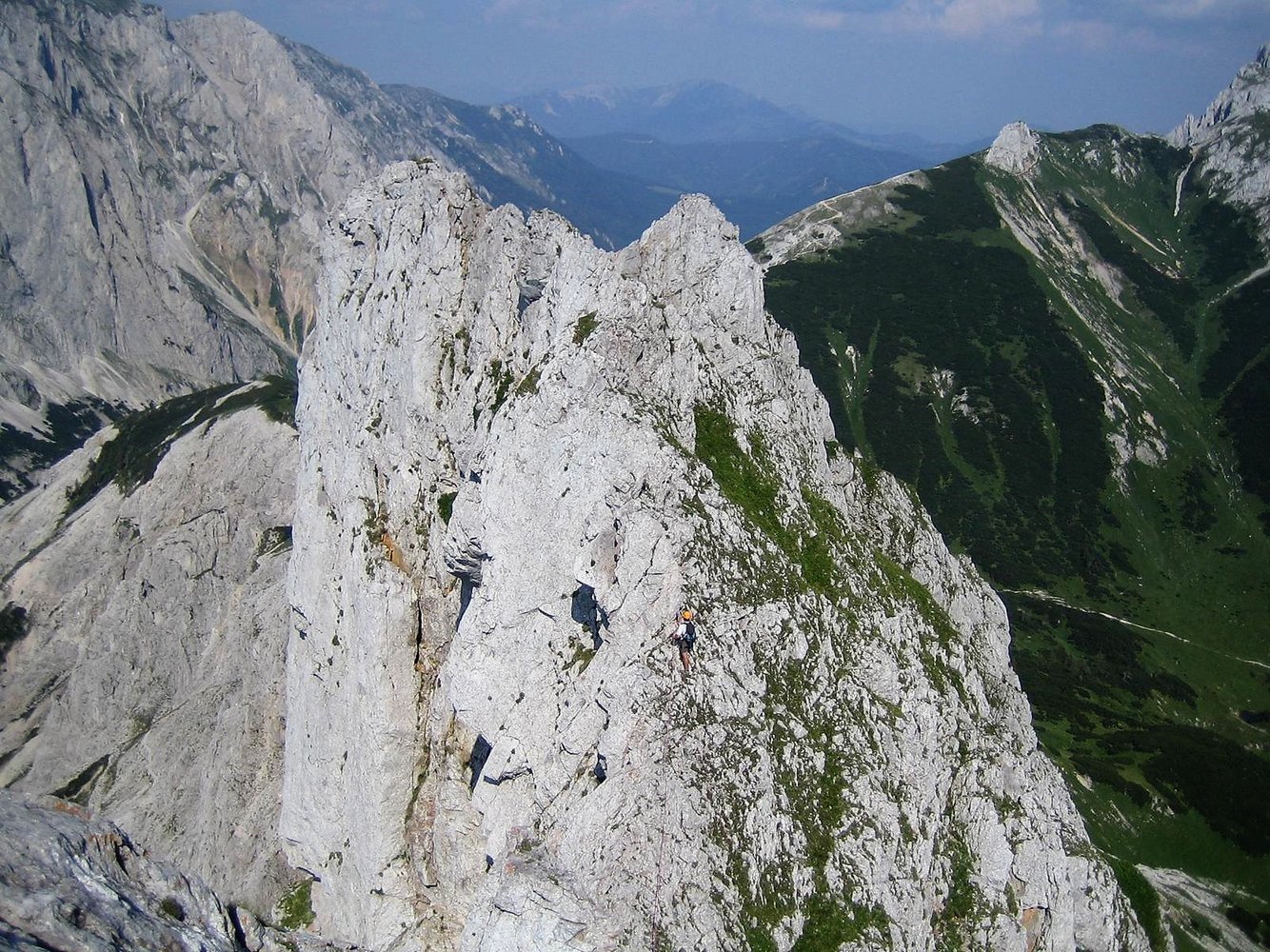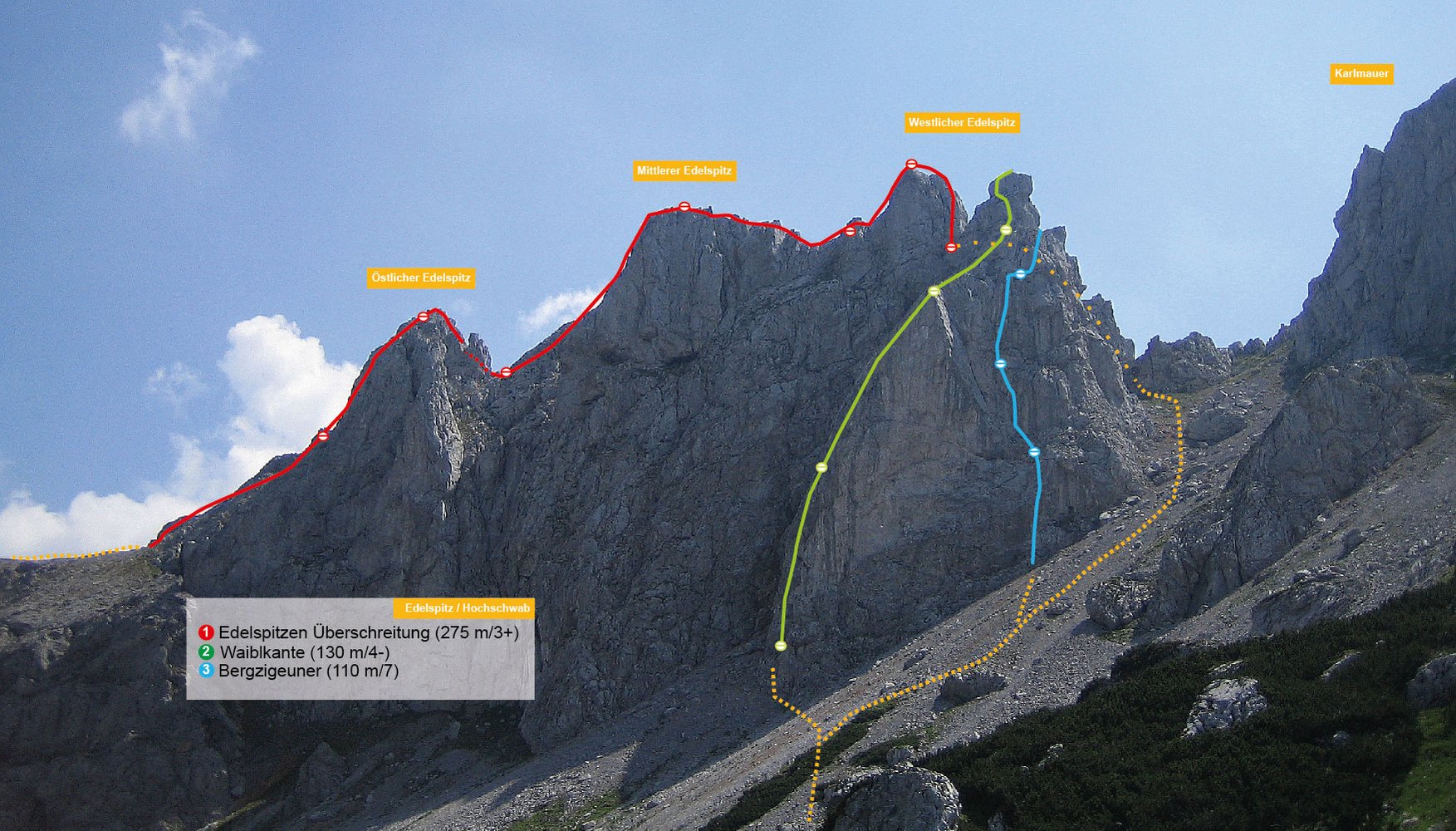 Die Überschreitung der Westlichen, Mittleren und Östlichen Edelspitzen ist eine lohnende, recht gut mit Bohrhaken abgesicherte Route, aber auch nicht immer feste im Nahbereich der Voisthaler Hütte. Vom Tal ist der Zustieg recht weit, von der Hütte braucht man aber nur noch gute 20 Min. In Verbindung mit der Waiblkante (4-) oder der Karlmauer Nordwand (3) kommt man aber zu einem ausgefüllten Tourentag.