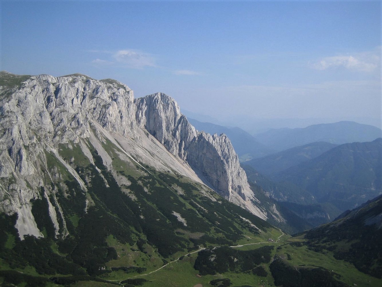 Vom Ende des Grats dem Geröllrücken nach Osten folgen bis man auf den Ochsensteig (er führt zurück zur Voisthaler Hütte) trifft, noch weiter nach Osten zum Fölzsattel und hier links (nach Norden) zum Zustiegsweg zur Voisthaler Hütte absteigen.