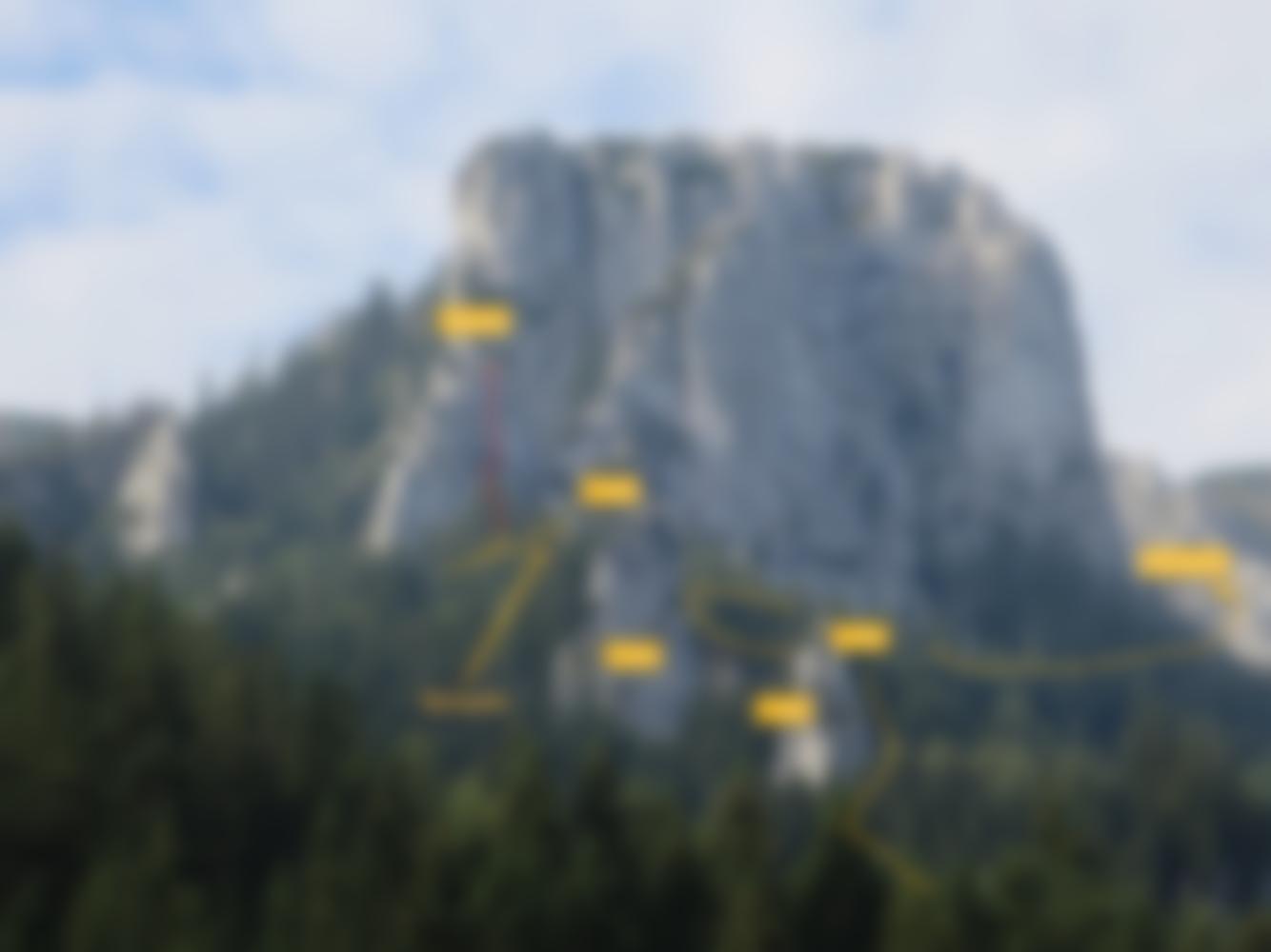 Im Bereich der Ortstafel "Dobrein" (ist keine richtige Ortstafel mit blauem Rand sondern klein und weiss) bei einen Bauernhof über den Fluss rechtshaltend einer grasigen Forststr. auf einen große Forststraße folgen. Dieser kurz nach rechts zu einer Wiese folgen (links von der Wiese ein Hochsitz). Am linken Wiesenrand aufwärts und auf kl. Steig in in einer Art flachen Graben den Wald hinauf bis man wieder auf eine gr. Forststr. kommt (rechts sieht man eine Felswand mit Materl). Die Forststraße queren und über Steigspuren steil die Böschung hinauf zum ersten Turm. Hier befindet sich ein Metallkasten mit dem Neu-Routenbuch. Nun immer rechts an den Tuermen vorbei ansteigen bis man unter die Hauptwand kommt. Der Wand entlang nach rechts queren und am Ende auch etwas absteigen, bis man an die Westseite der Burg kommt (rechts geht's steil in Tal) dem Steig bis zu einer Rinne folgen (hier sieht man schon die Türme mit den Routen) und durch die Rinne zum Einstieg aufsteigen.