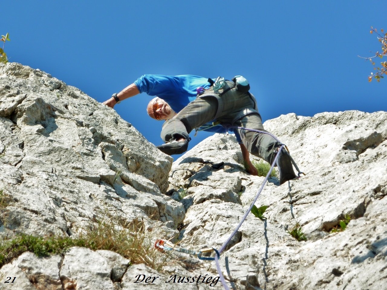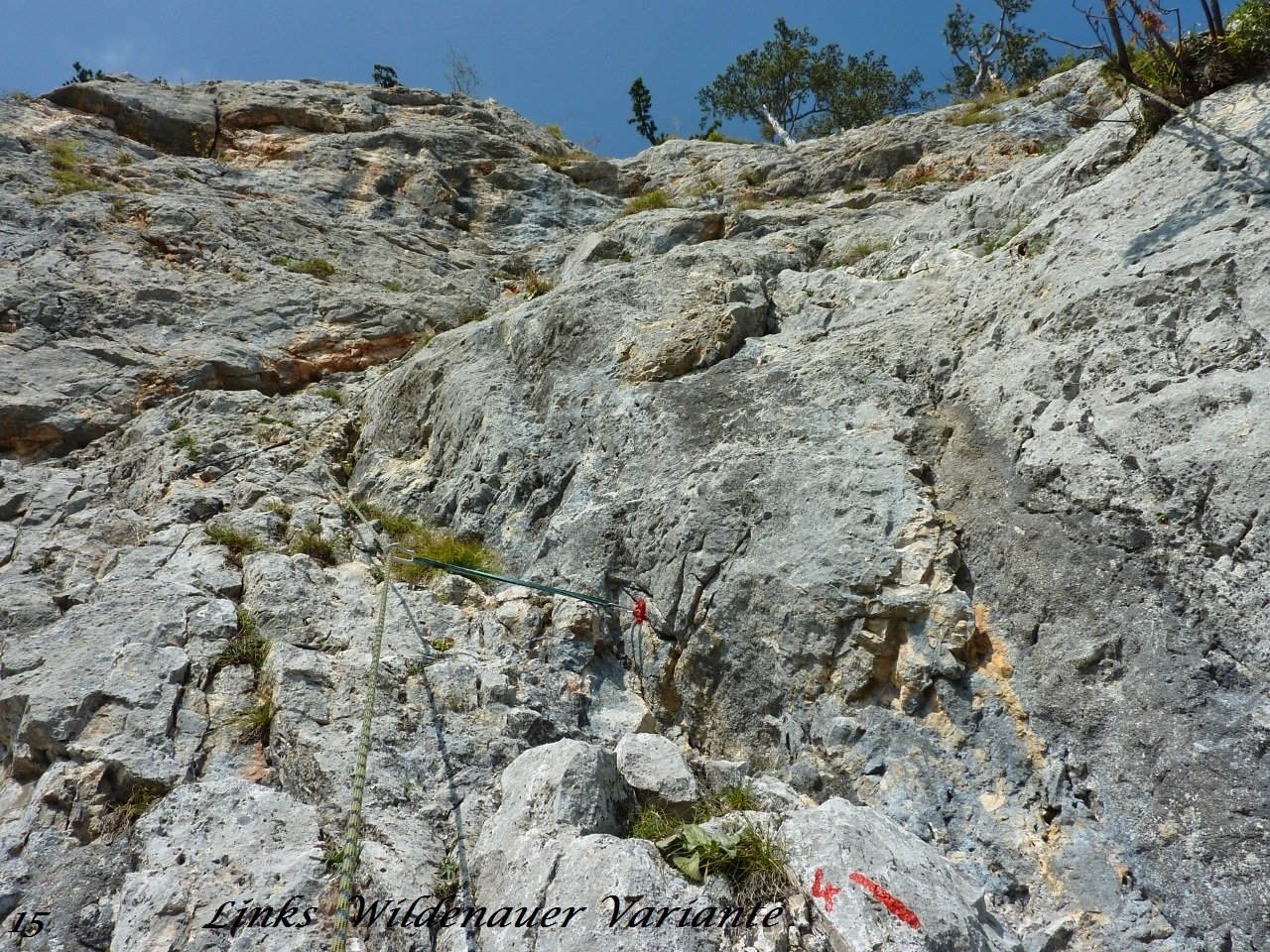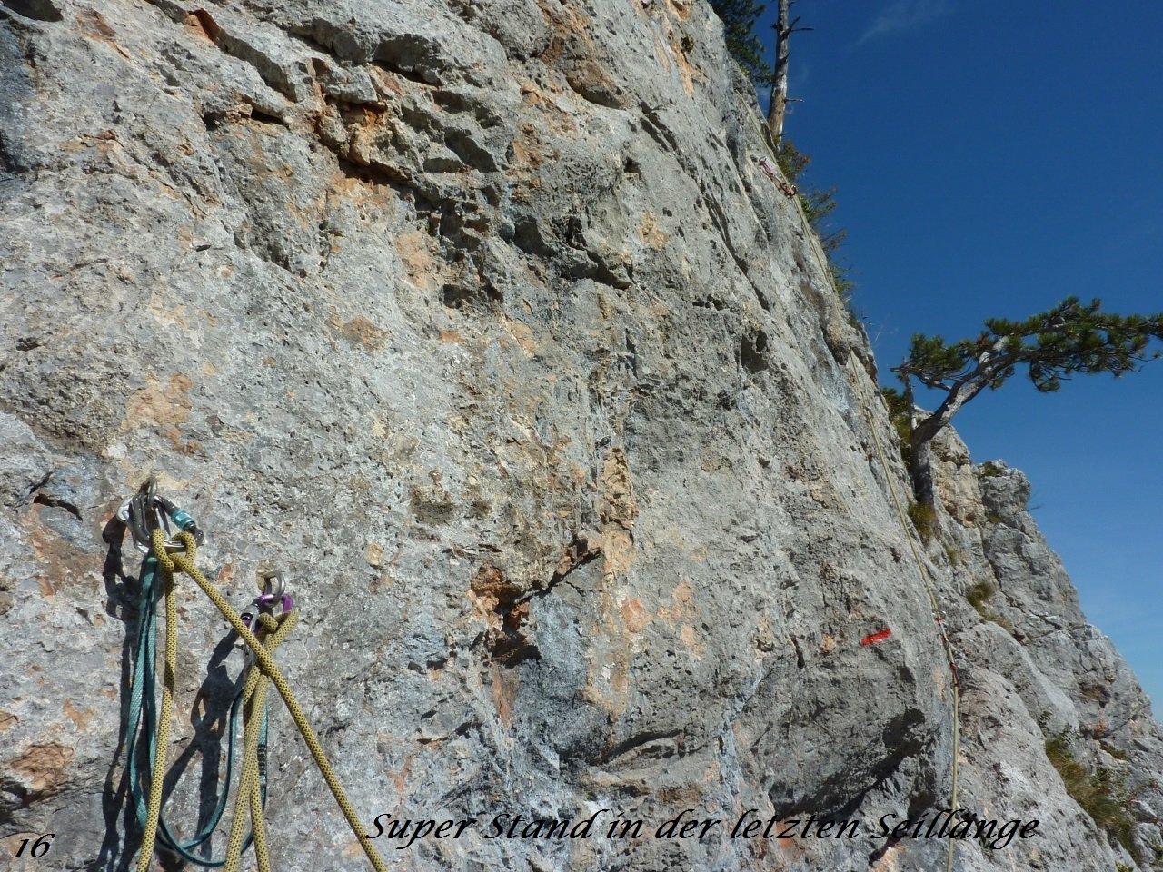 Vor den letzten beiden Seillängen kann man auch nach links zum Peternsteig queren und über diesen aussteigen. Siehe Topo!