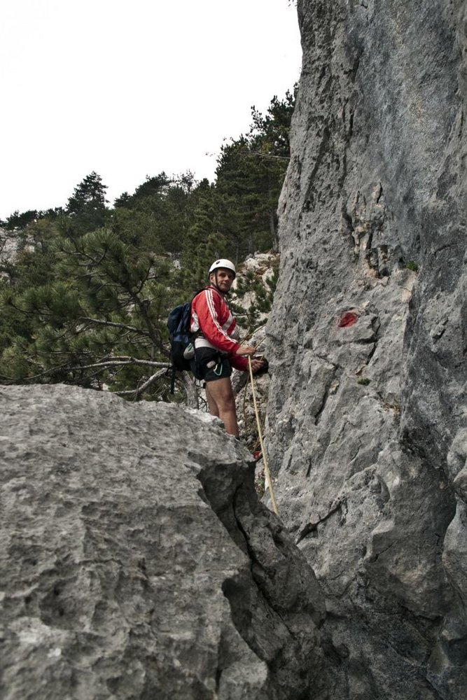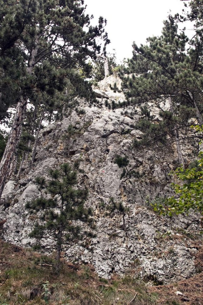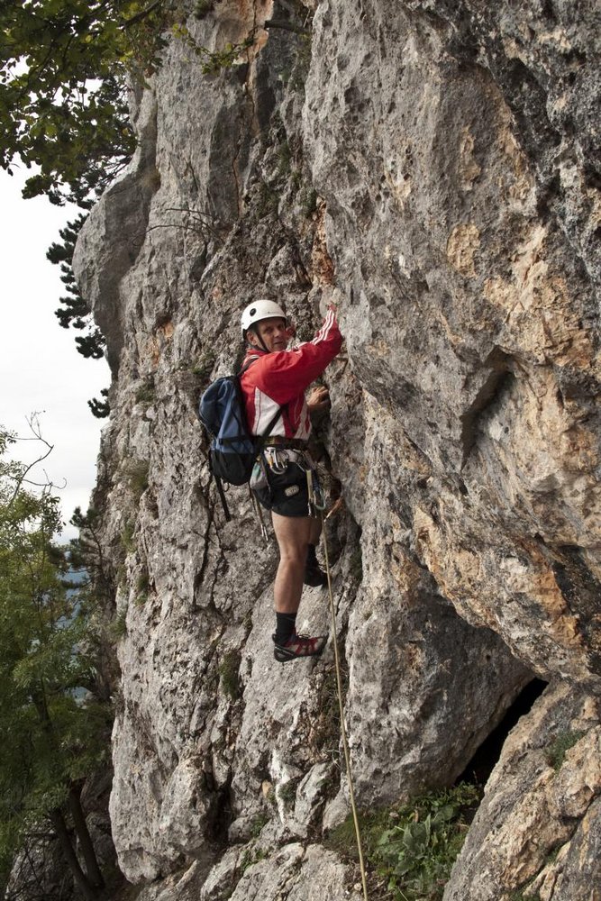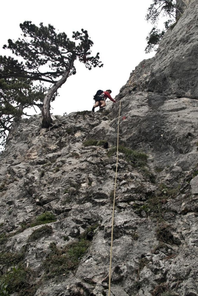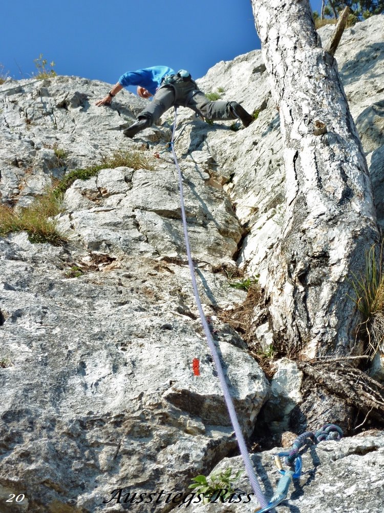 Vor den letzten beiden Seillängen kann man auch nach links zum Peternsteig queren und über diesen aussteigen. Siehe Topo!
