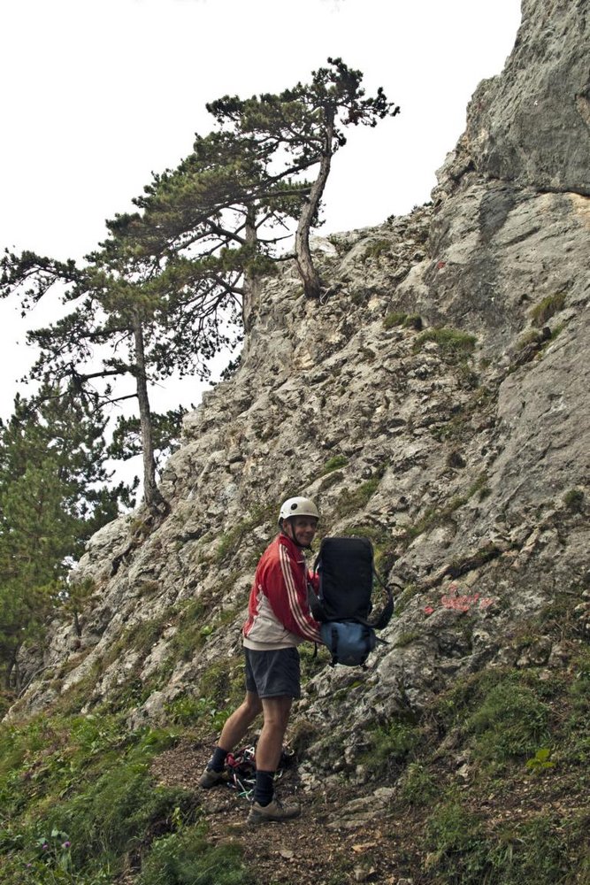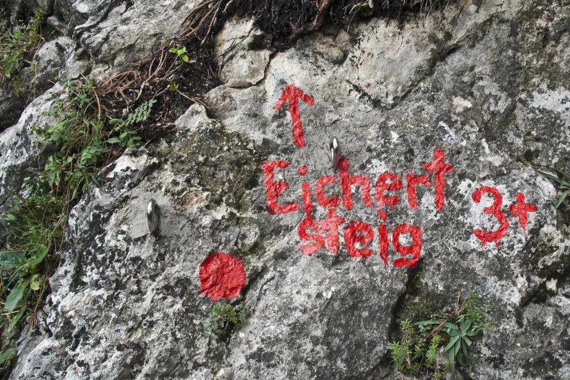 Vom Parkplatz zum "Seiser Toni" auf der bis zum Ende der Asphaltstraße. Hier führt links ein rot markierter Steig zur einer Forststraße hinauf. Auf der Forststraße 100 m nach rechts und wieder links über einen rot markierten Steig zum Wandfusssteig aufsteigen und in wenigen Schritten rechts hinauf zum Einstieg.