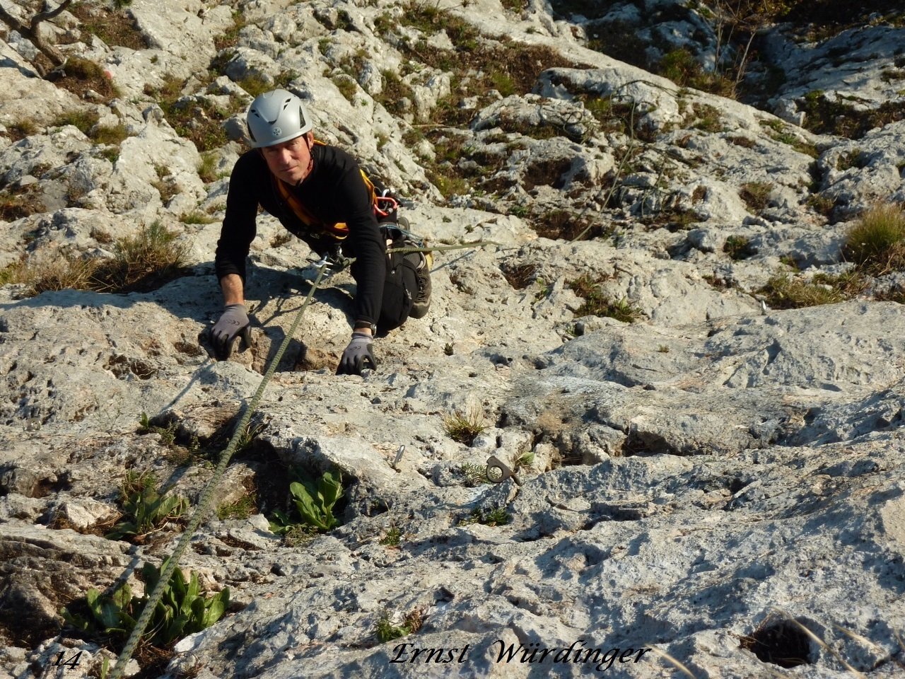 Der Eichertsteig wurde vor kurzem von P. Heihs und E. Würdinger geputzt und saniert und dadurch aus seinem langjährigen Dornröschenschlaf wach geküßt. Er bietet für diesen Schwierigkeitsgrad durchaus anregende und interessante Kletterei.