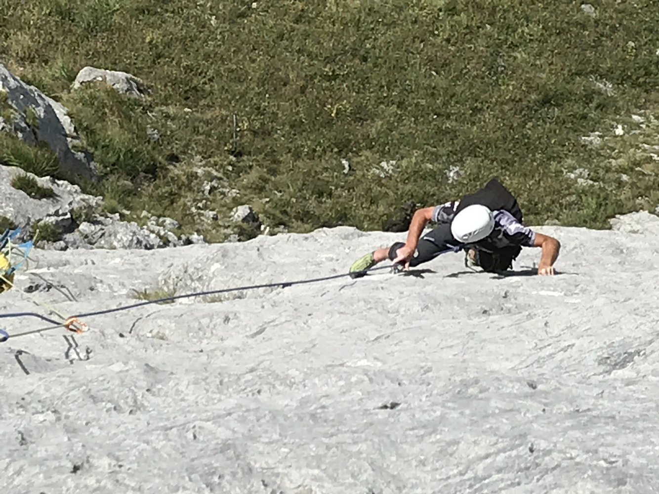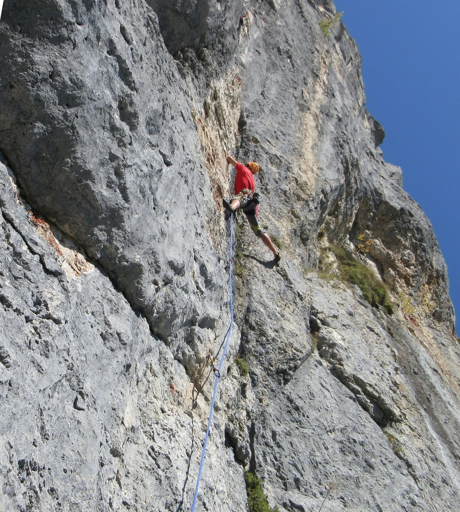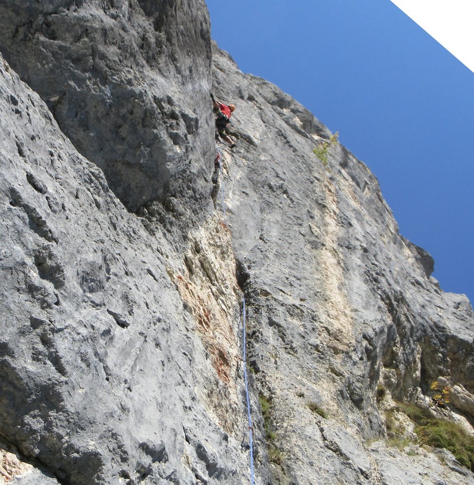 Alpine Sportkletterei mit teilweise längeren Hakenabständen. Der achte Grad ist obilgat